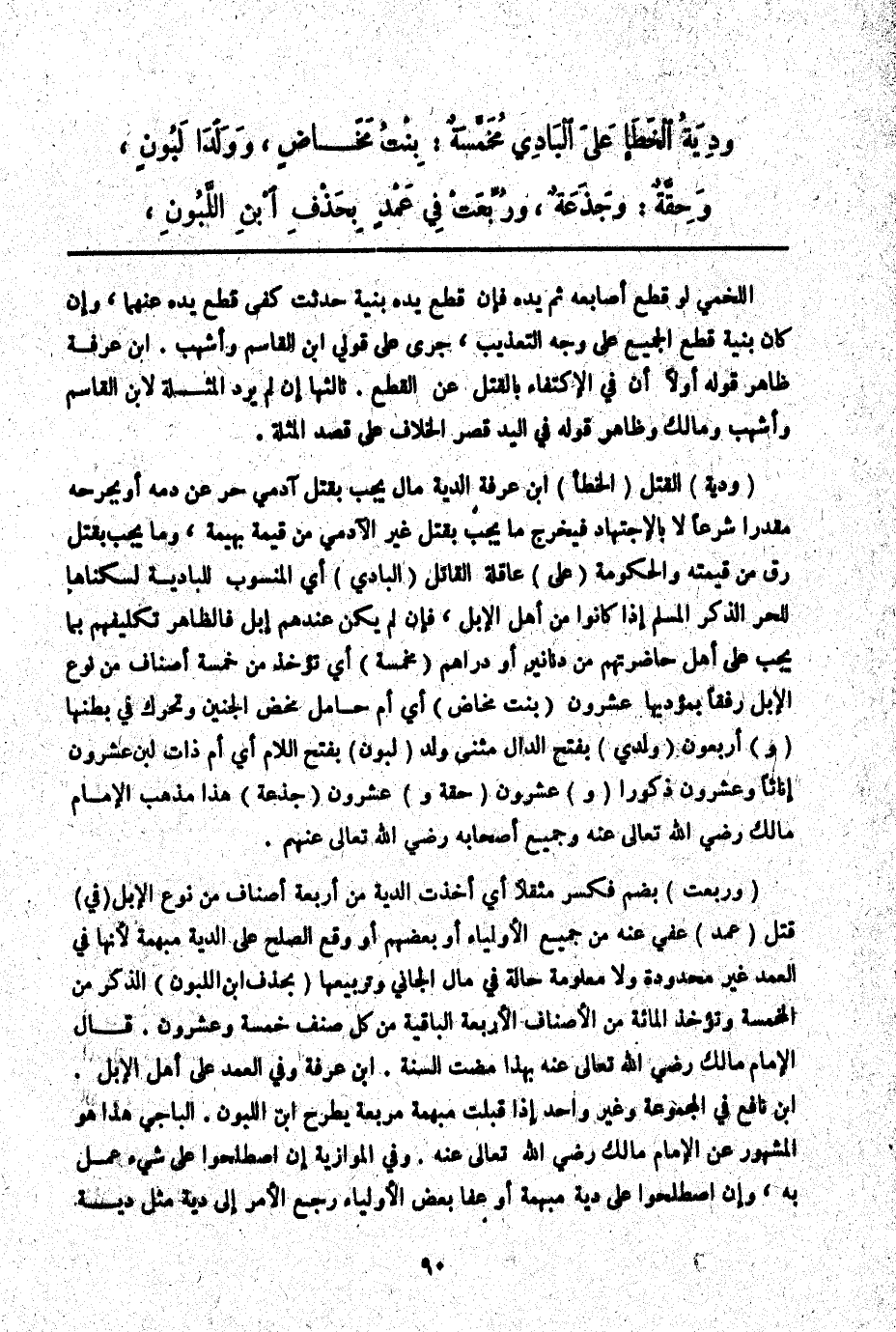 (وَدِيَةُ) الْقَتْلِ (الْخَطَأِ) ابْنُ عَرَفَةَ الدِّيَةُ مَالٌ يَجِبُ بِقَتْلِ آدَمِيٍّ حُرٍّ عَنْ دَمِهِ أَوْ بِجُرْحِهِ مُقَدَّرًا شَرْعًا لَا بِالِاجْتِهَادِ فَيَخْرُجُ مَا يَجِبُ بِقَتْلِ غَيْرِ الْآدَمِيِّ مِنْ قِيمَةِ بَهِيمَةٍ، وَمَا يَجِبُ بِقَتْلِ رِقٍّ مِنْ قِيمَتِهِ وَالْحُكُومَةُ (عَلَى) عَاقِلَةِ الْقَاتِلِ (الْبَادِي) أَيْ الْمَنْسُوبِ لِلْبَادِيَةِ لِسُكَّانِهَا لِلْحُرِّ الذَّكَرِ الْمُسْلِمِ إذَا كَانُوا مِنْ أَهْلِ الْإِبِلِ، فَإِنْ لَمْ يَكُنْ عِنْدَهُمْ إبِلٌ فَالظَّاهِرُ تَكْلِيفُهُمْ بِمَا يَجِبُ عَلَى أَهْلِ حَاضِرَتِهِمْ مِنْ دَنَانِيرَ أَوْ دَرَاهِمَ (مُخَمَّسَةٌ) أَيْ تُؤْخَذُ مِنْ خَمْسَةِ أَصْنَافٍ مِنْ نَوْعِ الْإِبِلِ رِفْقًا بِمُؤَدِّيهَا عِشْرُونَ (بِنْتُ مَخَاضٍ) أَيْ أُمِّ حَامِلِ مَخْضِ الْجَنِينِ وَتَحَرَّكَ فِي بَطْنِهَا (وَ) أَرْبَعُونَ (وَلَدَا) بِفَتْحِ الدَّالِ مُثَنَّى وَلَدٍ (لَبُونٍ) بِفَتْحِ اللَّامِ أَيْ أُمٍّ ذَاتِ لَبَنٍ عِشْرُونَ إنَاثًا وَعِشْرُونَ ذُكُورًا (وَ) عِشْرُونَ (حِقَّةً وَ) عِشْرُونَ (جَذَعَةً) هَذَا مَذْهَبُ الْإِمَامِ مَالِكٍ - رَضِيَ اللَّهُ تَعَالَى عَنْهُ - وَجَمِيعِ أَصْحَابِهِ - رَضِيَ اللَّهُ تَعَالَى عَنْهُمْ -.
