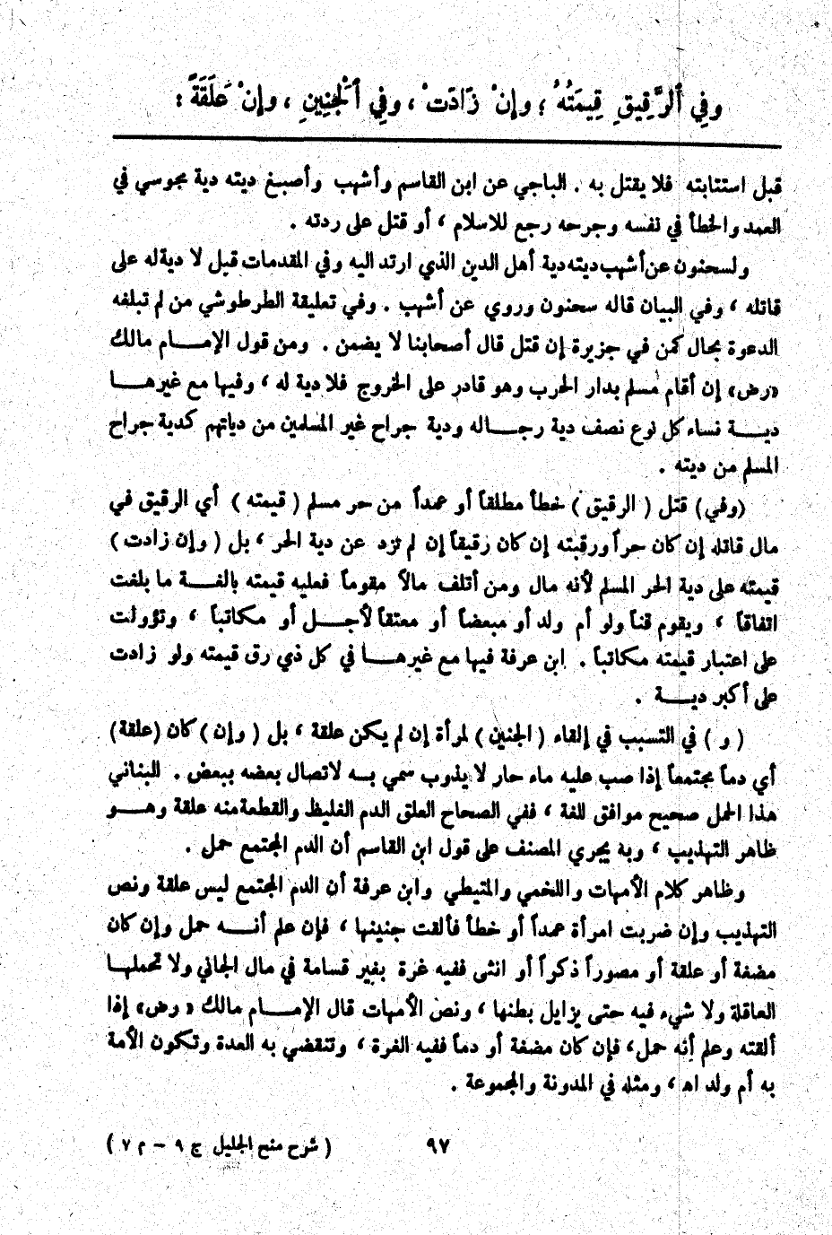 (وَفِي) قَتْلِ (الرَّقِيقِ) خَطَأً مُطْلَقًا أَوْ عَمْدًا مِنْ حُرٍّ مُسْلِمٍ (قِيمَتُهُ) أَيْ الرَّقِيقِ فِي مَالِ قَاتِلِهِ إنْ كَانَ حُرًّا وَرَقَبَتُهُ إنْ كَانَ رَقِيقًا إنْ لَمْ تَزِدْ عَنْ دِيَةِ الْحُرِّ، بَلْ (وَإِنْ زَادَتْ) قِيمَتُهُ عَلَى دِيَةِ الْحُرِّ الْمُسْلِمِ لِأَنَّهُ مَالٌ وَمَنْ أَتْلَفَ مَالًا مُقَوَّمًا فَعَلَيْهِ قِيمَتُهُ بَالِغَةً مَا بَلَغَتْ اتِّفَاقًا، وَيُقَوَّمُ قِنًّا وَلَوْ أُمَّ وَلَدٍ أَوْ مُبَعَّضًا أَوْ مُعْتَقًا لِأَجَلٍ أَوْ مُكَاتَبًا، وَتُؤُوِّلَتْ عَلَى اعْتِبَارِ قِيمَتِهِ مُكَاتَبًا. ابْنُ عَرَفَةَ فِيهَا مَعَ غَيْرِهَا فِي كُلِّ ذِي رِقٍّ قِيمَتُهُ وَلَوْ زَادَتْ عَلَى أَكْبَرِ دِيَةٍ (وَ) فِي التَّسَبُّبِ فِي إلْقَاءِ (الْجَنِينِ) لِمَرْأَةٍ إنْ لَمْ يَكُنْ عَلَقَةً، بَلْ (وَإِنْ) كَانَ (عَلَقَةً) أَيْ دَمًا مُجْتَمِعًا إذَا صُبَّ عَلَيْهِ مَاءٌ حَارٌّ لَا يَذُوبُ سُمِّيَ بِهِ لِاتِّصَالِ بَعْضِهِ بِبَعْضٍ. الْبُنَانِيُّ هَذَا الْحَمْلُ صَحِيحٌ مُوَافِقٌ لِلُّغَةِ، فَفِي الصِّحَاحِ الْعَلَقُ الدَّمُ الْغَلِيظُ وَالْقِطْعَةُ مِنْهُ عَلَقَةٌ وَهُوَ ظَاهِرُ التَّهْذِيبِ، وَبِهِ يَجْرِي الْمُصَنِّفُ عَلَى قَوْلِ ابْنِ الْقَاسِمِ أَنَّ الدَّمَ الْمُجْتَمِعَ حَمْلٌ.