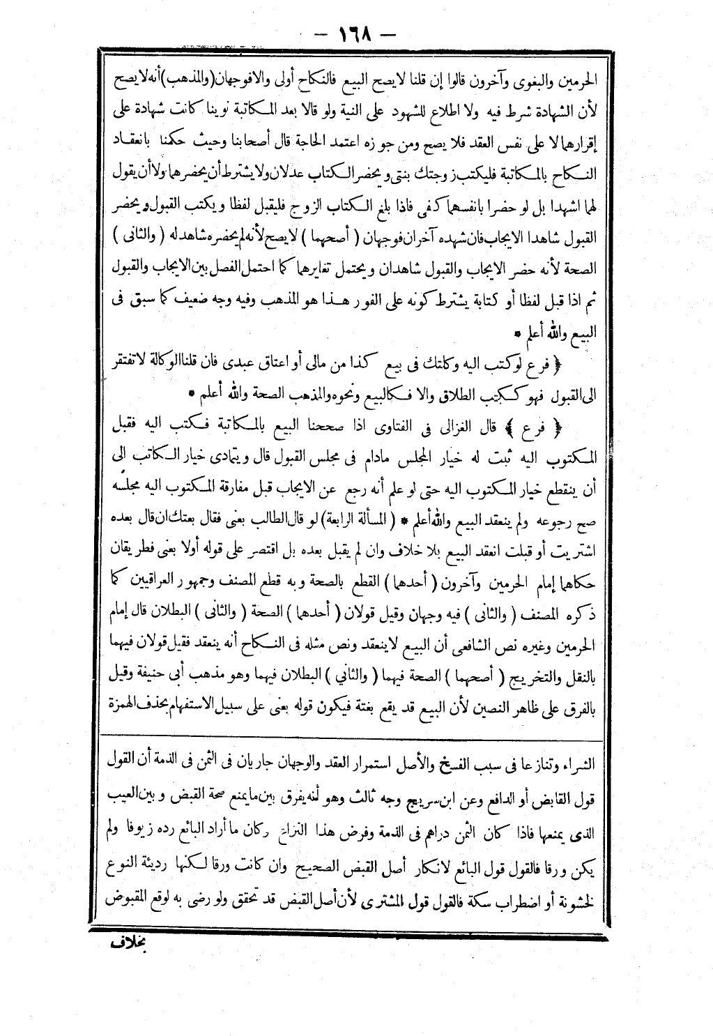 الشراء وتنازعا في سبب الفسخ والاصل استمرار العقد والوجهان جاريان في الثمن في الذمة أن القول قول القابض أو الدافع وعن ابن سريج وجه ثالث وهو أنه يفرق بين ما يمنع صحة القبض وبين العيب الذى يمنعها فإذا كان الثمن دراهم في الذمة وفرض هذا النزاع وكان ما أراد البائع رده زيوفا ولم يكن ورقا فالقول قول البائع لانكار أصل القبض الصحيح وان كانت ورقا لكنها رديئة النوع لخشونة أو اضطراب سكة فالقول قول المشترى لان أصل القبض قد تحقق ولو رضى به لوقع المقبوض