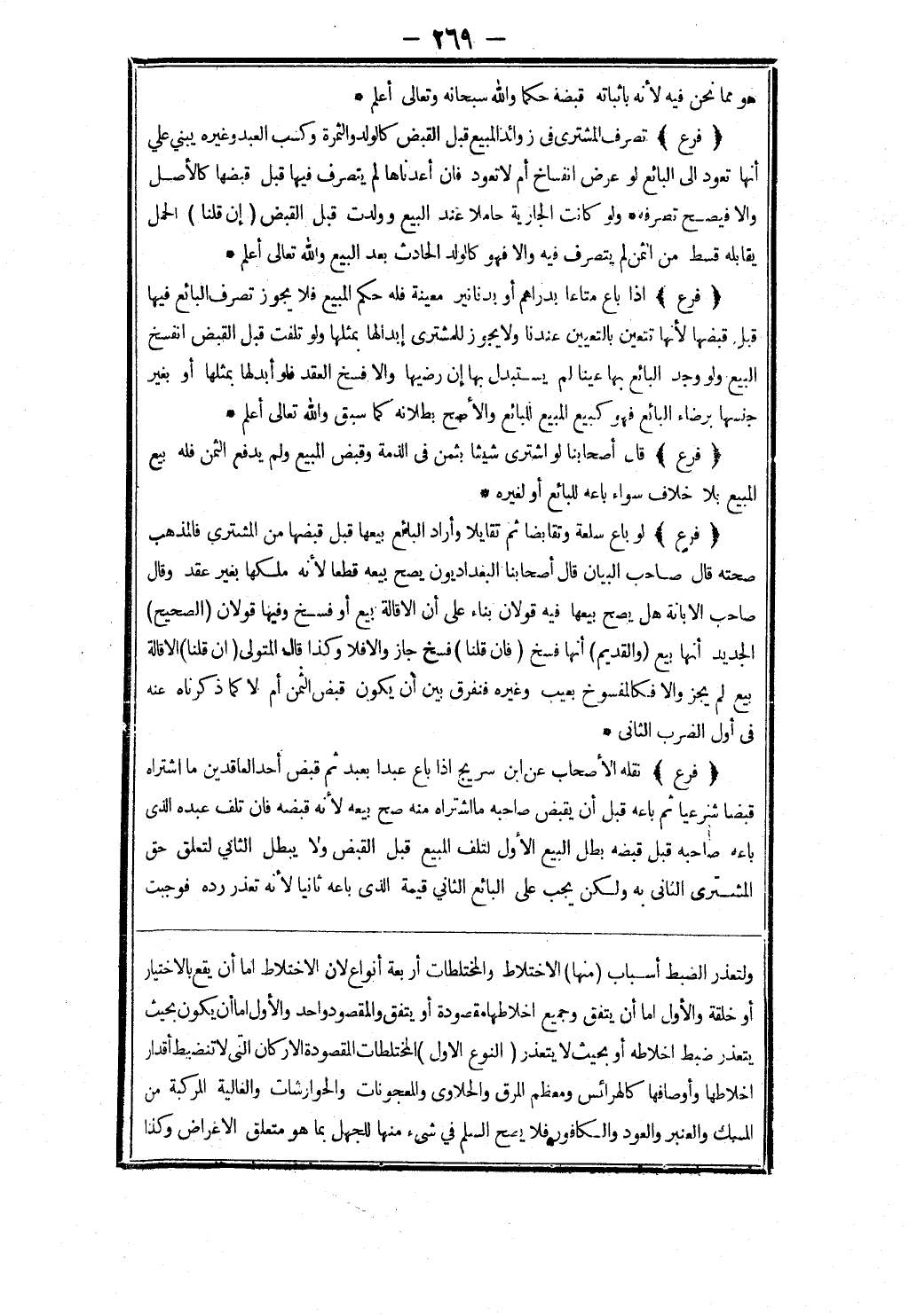 ولتعذر الضبط أسباب (منها) الاختلاط والمختلطات أربعة أنواع لان الاختلاط اما أن يقع بالاختيار أو خلقة والاول اما أن يتفق وجميع اخلاطها مقصودة أو يتفق والمقصود واحد والاول اما أن يكون بحيث يتعذر ضبط اخلاطه أو بحيث لا يتعذر (النوع الاول) المختلطات المقصودة الاركان التى لا تنضبط أقدار اخلاطها وأوصافها كالهرائس ومعظم المرق والحلاوى والمعجونات والحوارشات والغالية المركبة من المسك والعنبر والعود والكافور فلا يصح السلم في شئ منها للجهل بما هو متعلق الاغراض وكذا