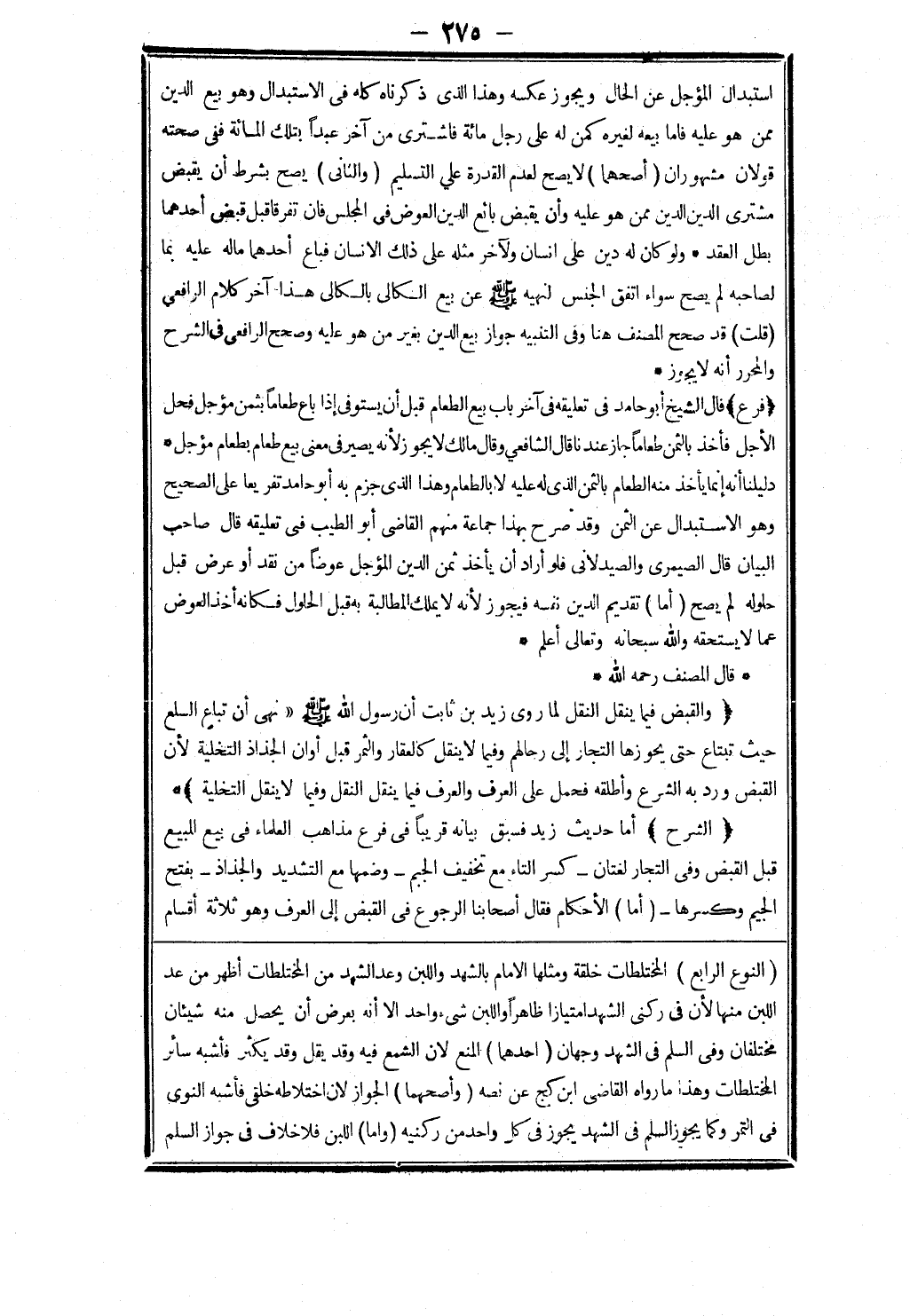 (النوع الرابع) المختلطات خلقة ومثلها الامام بالشهد واللبن وعد الشهد من المختلطات أظهر من عد اللبن منها لان في ركني الشهد امتيازا ظاهرا واللبن شئ واحد الا أنه بعرض أن يحصل منه شيئان مختلفان وفى السلم في الشهد وجهان (احدهما) المنع لان الشمع فيه وقد يقل وقد يكثر فأشبه سائر المختلطات وهذا ما رواه القاضى ابن كج عن نصه (وأصحهما) الجواز لان اختلاطه خلقي فأشبه النوى في التمر وكما يجوز السلم في الشهد يجوز في كل واحد من ركنيه (واما) اللبن فلا خلاف في جواز السلم
