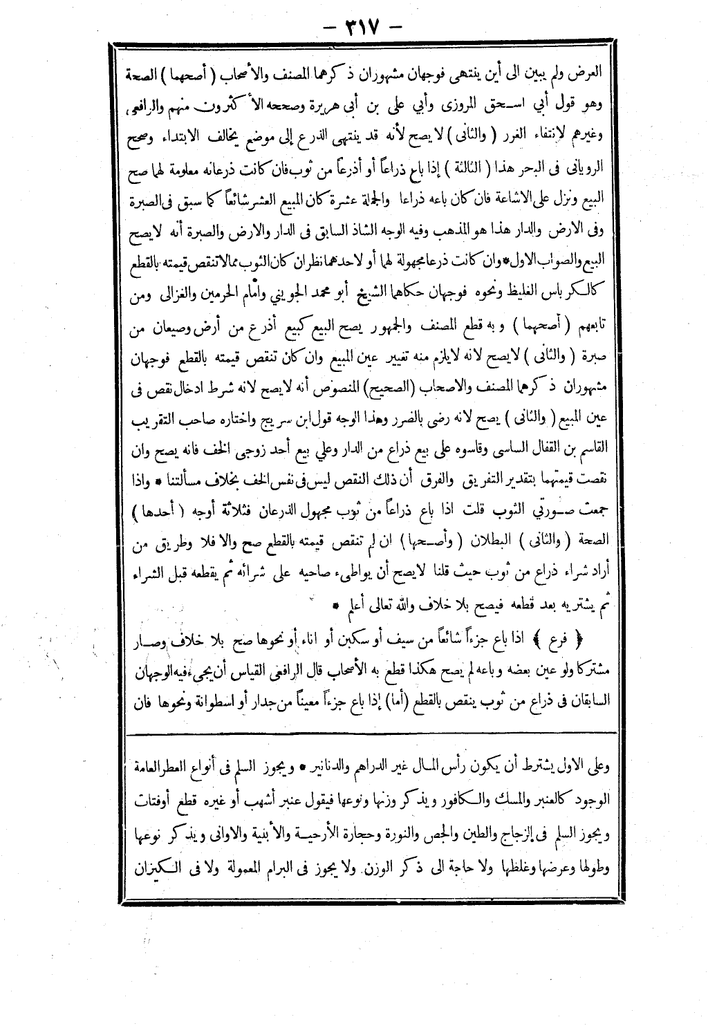 وعلى الاول يشترط أن يكون رأس المال غير الدراهم والدنانير * ويجوز السلم في أنواع العطر العامة الوجود كالعنبر والمسك والكافور ويذكر وزنها ونوعها فيقول عنبر أشهب أو غيره قطع أو فتات ويجوز السلم في الزجاج والطين والجص والنورة وحجارة الارحية والابنية والاوانى ويذكر نوعها وطولها وعرضها وغلظها ولا حاجة إلى ذكر الوزن ولا يجوز في البرام المعمولة ولا في الكيزان