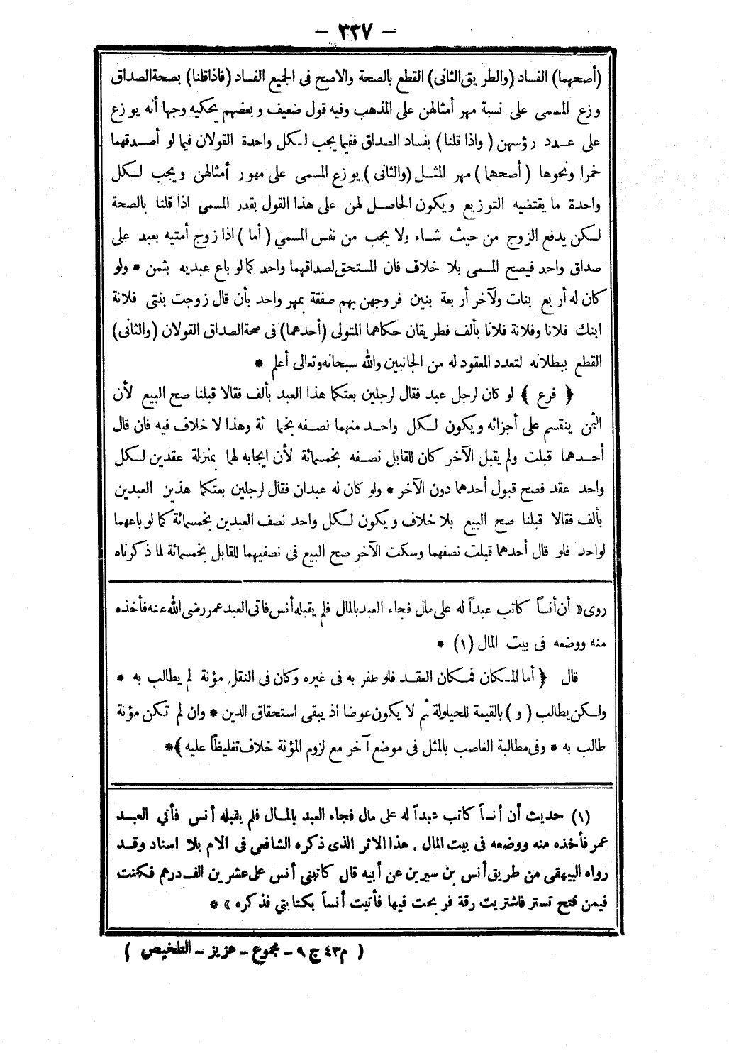 حديث أن أنسا كاتب عبدا له على مال فجاء العبد بالمال فلم يقبله أنس فأتي العبد عمر فأخذه منه ووضعه في بيت المال.