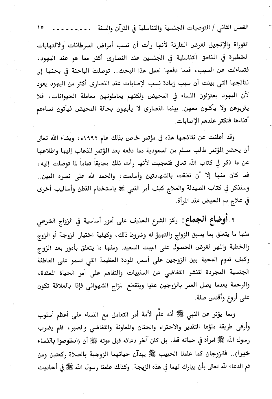 التوراة والإنجيل لغرض المقارنة لأنها رأت أن نسب أمراض السرطانات والالتهابات الخطيرة في المناطق التناسلية في الجنسين عند النصارى أكثر مما هو عند اليهود، فتساءلت عن السبب، فمما دفعها لعمل هذا البحث .. توصلت الباحثة في بحثها إلى نتائجها التي بينت أن سبب زيادة نسب الإصابات عند النصارى أكثر من اليهود يعود لأن اليهود يعتزلون النساء في المحيض ولكنهم يعاملونهن معاملة الحيوانات، فلا يقربوهن ولا يأكلون معهن. بينما النصارى لا يأبهون بحالة المحيض فيأتون نساءهم أثناءها فتكثر عندهم الإصابات.
