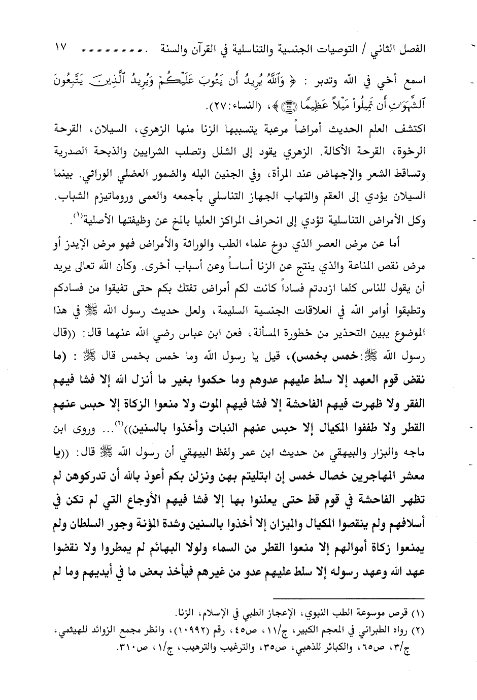 أما عن مرض العصر الذي دوخ علماء الطب والوراثة والأمراض فهو مرض الإيدز أو مرض نقص المناعة والذي ينتج عن الزنا أساسا وعن أسباب أخرى. وكأن اللّه تعالى يريد أن يقول للناس كلما ازددتم فسادا كانت لكم أمراض تفتك بكم حتى تفيقوا من فسادكم وتطبقوا أوامر اللّه في العلاقات الجنسية السليمة، ولعل حديث رسول اللّه صلى اللّه عليه وسلم في هذا الموضوع يبين التحذير من خطورة المسألة، فعن ابن عباس رضي اللّه عنهما قال: ((قال رسول اللّه صلى اللّه عليه وسلم: خمس بخمس)، قيل يا رسول اللّه وما خمس بخمس قال صلى اللّه عليه وسلم: (ما نقض قوم العهد إلا سلط عليهم عدوهم وما حكموا بغير ما أنزل اللّه إلا فشا فيهم الفقر ولا ظهرت فيهم الفاحشة إلا فشا فيهم الموت ولا منعوا الزكاة إلا حبس عنهم القطر ولا طففوا المكيال إلا حبس عنهم النبات وأخذوا بالسنين)) «2» ... وروى ابن ماجة والبزار والبيهقي من حديث ابن عمر ولفظ البيهقي أن رسول اللّه صلى اللّه عليه وسلم قال: ((يا معشر المهاجرين خصال خمس إن ابتليتم بهن ونزلن بكم أعوذ باللّه أن تدركوهن لم تظهر الفاحشة في قوم قط حتى يعلنوا بها إلا فشا فيهم الأوجاع التي لم تكن في أسلافهم ولم ينقصوا المكيال والميزان إلا أخذوا بالسنين وشدة المئونة وجور السلطان ولم يمنعوا زكاة أموالهم إلا منعوا القطر من السماء ولو لا البهائم لم يمطروا ولا نقضوا عهد اللّه وعهد رسوله إلا سلط عليهم عدو من غيرهم فيأخذ بعض ما في أيديهم وما لم