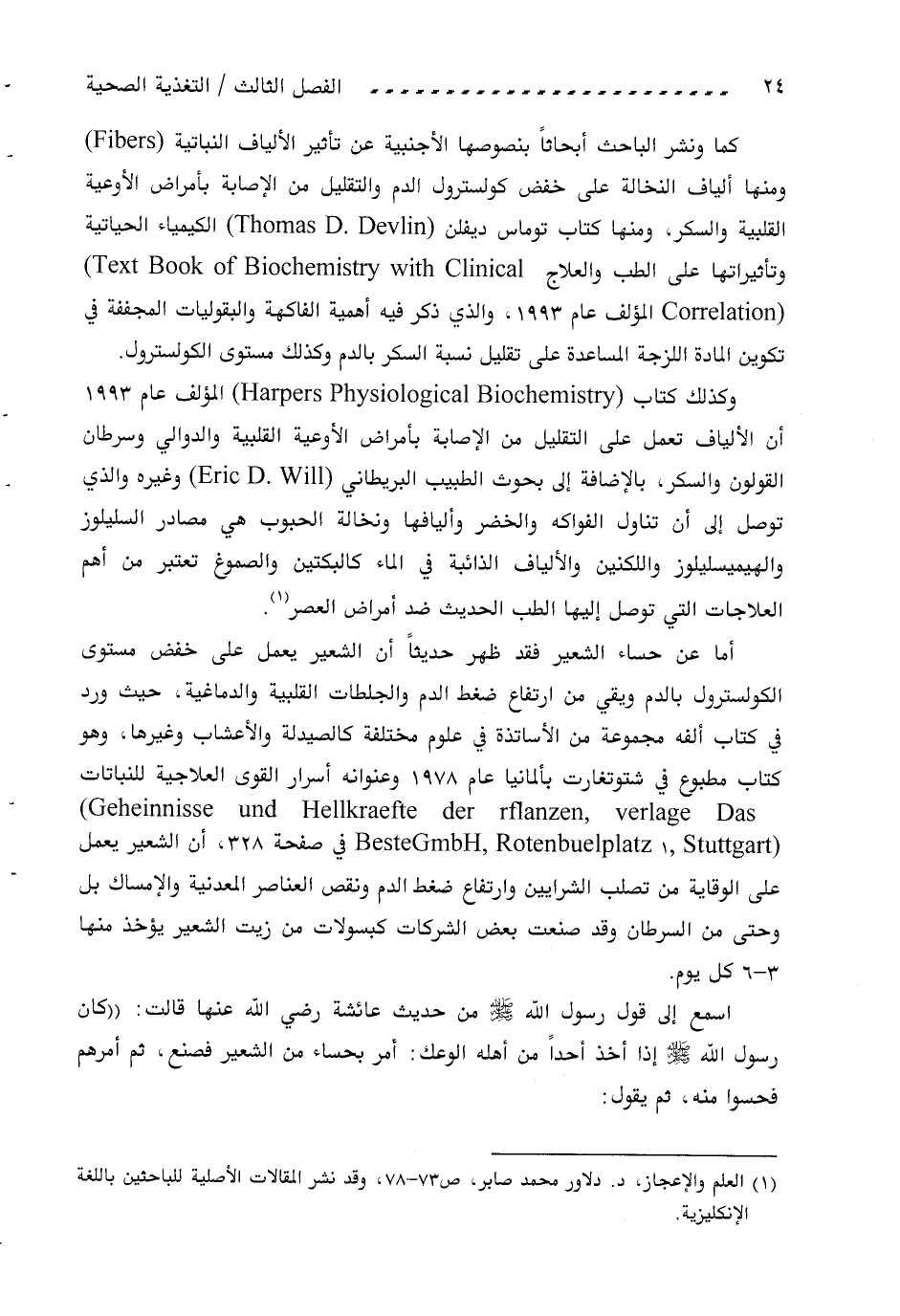 وكذلك كتاب ( harpers physiological biochemistry) المؤلف عام 1993 أن الألياف تعمل على التقليل من الإصابة بأمراض الأوعية القلبية والدوالي وسرطان القولون والسكر، بالإضافة إلى بحوث الطبيب البريطاني ( eric d .will) وغيره والذي توصل إلى أن تناول الفواكه والخضر وأليافها ونخالة الحبوب هي مصادر السليلوز والهيميسليلوز واللكنين والألياف الذائبة في الماء كالبكتين والصموغ تعتبر من أهم العلاجات التي توصل إليها الطب الحديث ضد أمراض العصر «1».