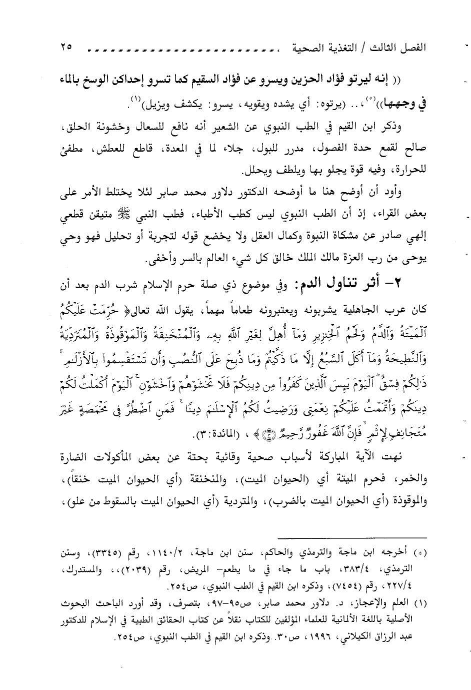 (1) أخرجه ابن ماجة والترمذي والحاكم، سنن ابن ماجة، 2/ 1140، رقم (3345)، وسنن الترمذي، 4/ 383، باب ما جاء في ما يطعم - المريض، رقم (2039)،، والمستدرك، 4/ 227، رقم (7454)، وذكره ابن القيم في الطب النبوي، ص 254.
