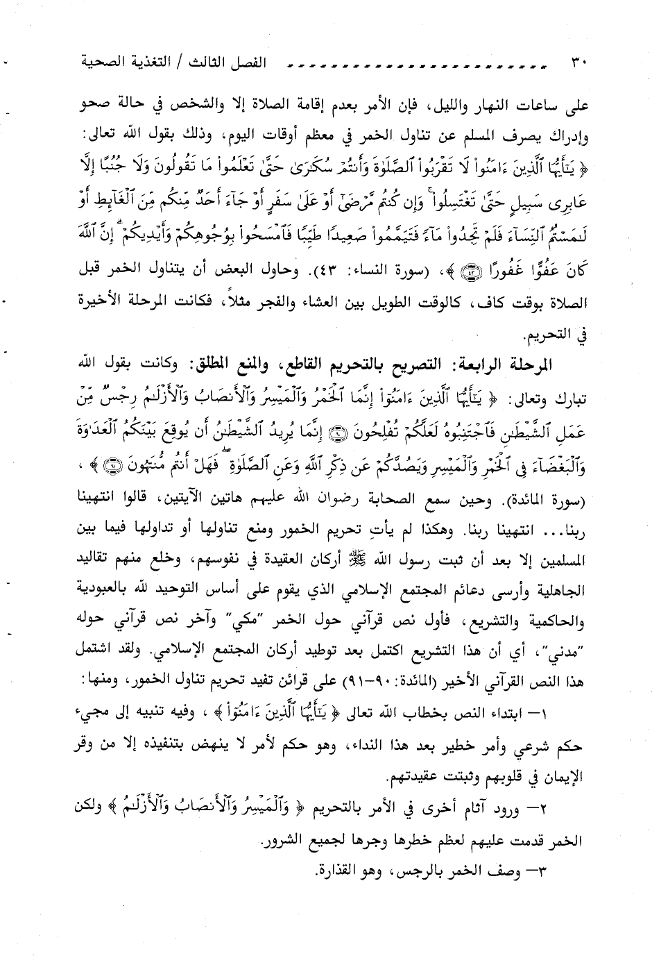 : وكانت بقول اللّه تبارك وتعالى: يا أَيُّهَا الَّذِينَ آمَنُوا إِنَّمَا الْخَمْرُ والْمَيْسِرُ والْأَنْصابُ والْأَزْلامُ رِجْسٌ مِنْ عَمَلِ الشَّيْطانِ فَاجْتَنِبُوهُ لَعَلَّكُمْ تُفْلِحُونَ (90) إِنَّما يُرِيدُ الشَّيْطانُ أَنْ يُوقِعَ بَيْنَكُمُ الْعَداوَةَ والْبَغْضاءَ فِي الْخَمْرِ والْمَيْسِرِ ويَصُدَّكُمْ عَنْ ذِكْرِ اللَّهِ وعَنِ الصَّلاةِ فَهَلْ أَنْتُمْ مُنْتَهُونَ (91)، (سورة المائدة). وحين سمع الصحابة رضوان اللّه عليهم هاتين الآيتين، قالوا انتهينا ربنا ... انتهينا ربنا. وهكذا لم يأت تحريم الخمور ومنع تناولها أو تداولها فيما بين المسلمين إلا بعد أن ثبت رسول اللّه صلى اللّه عليه وسلم أركان العقيدة في نفوسهم، وخلع منهم تقاليد الجاهلية وأرسى دعائم المجتمع الإسلامي الذي يقوم على أساس التوحيد للّه بالعبودية والحاكمية والتشريع، فأول نص قرآني حول الخمر" مكي" وآخر نص قرآني حوله" مدني"، أي أن هذا التشريع اكتمل بعد توطيد أركان المجتمع الإسلامي. ولقد اشتمل هذا النص القرآني الأخير (المائدة: 90 - 91) على قرائن تفيد تحريم تناول الخمور، ومنها: