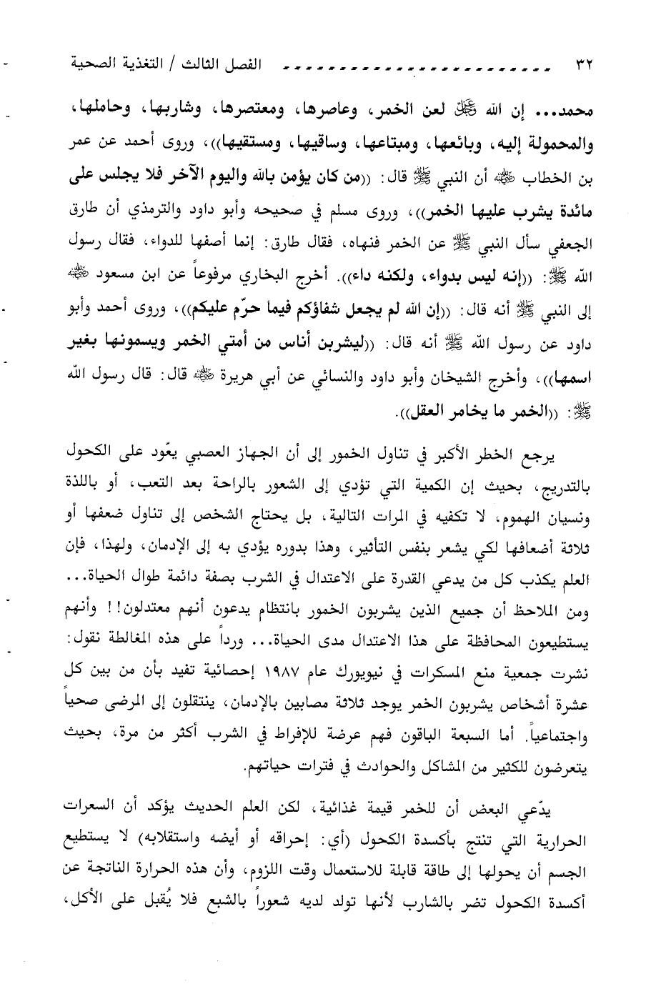 محمد ... إن اللّه عزّ وجلّ لعن الخمر، وعاصرها، ومعتصرها، وشاربها، وحاملها، والمحمولة إليه، وبائعها، ومبتاعها، وساقيها، ومستقيها))، وروى أحمد عن عمر بن الخطاب رضي اللّه عنه أن النبي صلى اللّه عليه وسلم قال: ((من كان يؤمن باللّه واليوم الآخر فلا يجلس على مائدة يشرب عليها الخمر))، وروى مسلم في صحيحه وأبو داود والترمذي أن طارق الجعفي سأل النبي صلى اللّه عليه وسلم عن الخمر فنهاه، فقال طارق: إنما أصفها للدواء، فقال رسول اللّه صلى اللّه عليه وسلم: ((إنه ليس بدواء، ولكنه داء)). أخرج البخاري مرفوعا عن ابن مسعود رضي اللّه عنه إلى النبي صلى اللّه عليه وسلم أنه قال: ((إن اللّه لم يجعل شفاؤكم فيما حرّم عليكم))، وروى أحمد وأبو داود عن رسول اللّه صلى اللّه عليه وسلم أنه قال: ((ليشربن أناس من أمتي الخمر ويسمونها بغير اسمها))، وأخرج الشيخان وأبو داود والنسائي عن أبي هريرة رضي اللّه عنه قال: قال رسول اللّه صلى اللّه عليه وسلم: ((الخمر ما يخامر العقل)).