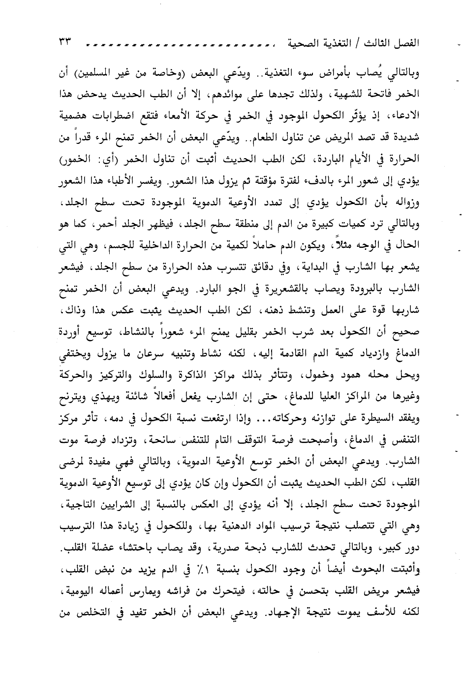 وبالتالي يصاب بأمراض سوء التغذية .. ويدّعي البعض (وخاصة من غير المسلمين) أن الخمر فاتحة للشهية، ولذلك تجدها على موائدهم، إلا أن الطب الحديث يدحض هذا الادعاء، إذ يؤثّر الكحول الموجود في الخمر في حركة الأمعاء فتقع اضطرابات هضمية شديدة قد تصد المريض عن تناول الطعام .. ويدّعي البعض أن الخمر تمنح المرء قدرا من الحرارة في الأيام الباردة، لكن الطب الحديث أثبت أن تناول الخمر (أي: الخمور) يؤدي إلى شعور المرء بالدفء لفترة مؤقتة ثم يزول هذا الشعور. ويفسر الأطباء هذا الشعور وزواله بأن الكحول يؤدي إلى تمدد الأوعية الدموية الموجودة تحت سطح الجلد، وبالتالي ترد كميات كبيرة من الدم إلى منطقة سطح الجلد، فيظهر الجلد أحمر، كما هو الحال في الوجه مثلا، ويكون الدم حاملا لكمية من الحرارة الداخلية للجسم، وهي التي يشعر بها الشارب في البداية، وفي دقائق تتسرب هذه الحرارة من سطح الجلد، فيشعر الشارب بالبرودة ويصاب بالقشعريرة في الجو البارد. ويدعي البعض أن الخمر تمنح شاربها قوة على العمل وتنشط ذهنه، لكن الطب الحديث يثبت عكس هذا وذاك، صحيح أن الكحول بعد شرب الخمر بقليل يمنح المرء شعورا بالنشاط، توسيع أوردة الدماغ وازدياد كمية الدم القادمة إليه، لكنه نشاط وتنبيه سرعان ما يزول ويختفي ويحل محله همود وخمول، وتتأثر بذلك مراكز الذاكرة والسلوك والتركيز والحركة وغيرها من المراكز العليا للدماغ، حتى إن الشارب يفعل أفعالا شائنة ويهذي ويترنح ويفقد السيطرة على توازنه وحركاته ... وإذا ارتفعت نسبة الكحول في دمه، تأثر مركز التنفس في الدماغ، وأصبحت فرصة التوقف التام للتنفس سانحة، وتزداد فرصة موت الشارب. ويدعي البعض أن الخمر توسع الأوعية الدموية، وبالتالي فهي مفيدة لمرضى القلب، لكن الطب الحديث يثبت أن الكحول وإن كان يؤدي إلى توسيع الأوعية الدموية الموجودة تحت سطح الجلد، إلا أنه يؤدي إلى العكس بالنسبة إلى الشرايين التاجيّة، وهي التي تتصلب نتيجة ترسيب المواد الدهنية بها، وللكحول في زيادة هذا الترسيب دور كبير، وبالتالي تحدث للشارب ذبحة صدرية، وقد يصاب باحتشاء عضلة القلب.