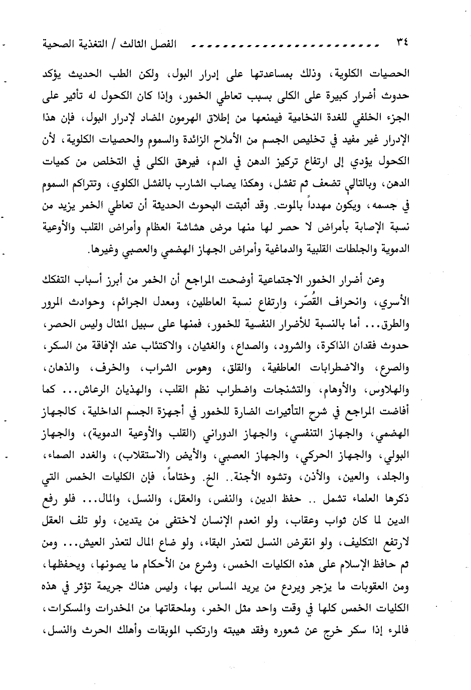 الحصيات الكلوية، وذلك بمساعدتها على إدرار البول، ولكن الطب الحديث يؤكد حدوث أضرار كبيرة على الكلى بسبب تعاطي الخمور، وإذا كان الكحول له تأثير على الجزء الخلفي للغدة النخامية فيمنعها من إطلاق الهرمون المضاد لإدرار البول، فإن هذا الإدرار غير مفيد في تخليص الجسم من الأملاح الزائدة والسموم والحصيات الكلوية، لأن الكحول يؤدي إلى ارتفاع تركيز الدهن في الدم، فيرهق الكلى في التخلص من كميات الدهن، وبالتالي تضعف ثم تفشل، وهكذا يصاب الشارب بالفشل الكلوي، وتتراكم السموم في جسمه، ويكون مهددا بالموت. وقد أثبتت البحوث الحديثة أن تعاطي الخمر يزيد من نسبة الإصابة بأمراض لا حصر لها منها مرض هشاشة العظام وأمراض القلب والأوعية الدموية والجلطات القلبية والدماغية وأمراض الجهاز الهضمي والعصبي وغيرها.