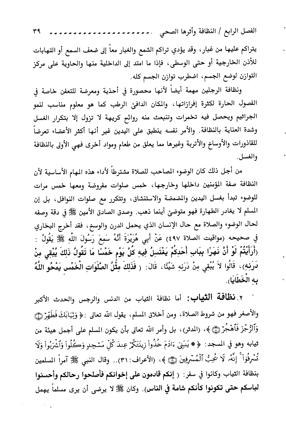 : أما نظافة الثياب من الدنس والرجس والحدث الأكبر والأصغر فهو من شروط الصلاة، ومن أخلاق المسلم، يقول اللّه تعالى: وثِيابَكَ فَطَهِّرْ (4) والرُّجْزَ فَاهْجُرْ (5)، (المدثر)، بل وأمر اللّه تعالى بأن يكون المسلم على أجمل هيئة من ثيابه وهو في المسجد:* يا بَنِي آدَمَ خُذُوا زِينَتَكُمْ عِنْدَ كُلِّ مَسْجِدٍ وكُلُوا واشْرَبُوا ولا تُسْرِفُوا إِنَّهُ لا يُحِبُّ الْمُسْرِفِينَ (31)، (الأعراف: 31) .. وقال النبي صلى اللّه عليه وسلم آمرا المسلمين بنظافة الثياب وكانوا في سفر: (إنكم قادمون على إخوانكم فأصلحوا رحالكم وأحسنوا لباسكم حتى تكونوا كأنكم شامة في الناس). وكان صلى اللّه عليه وسلم لا يرضى أن يرى مسلما يهمل