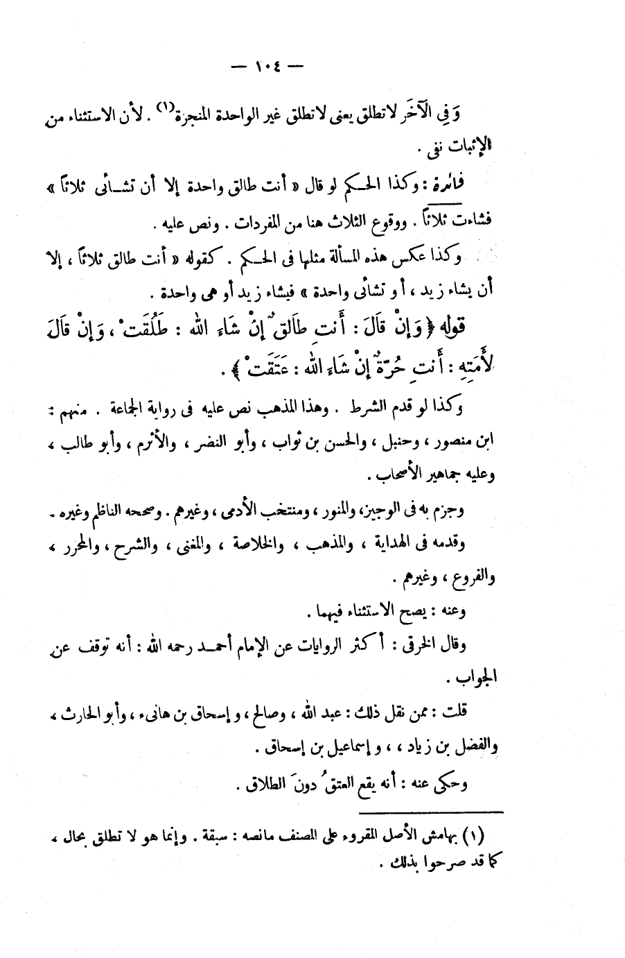 قَوْلُهُ (وَإِنْ قَالَ: أَنْتِ طَالِقٌ إنْ شَاءَ اللَّهُ: طَلُقَتْ، وَإِنْ قَالَ لِأَمَتِهِ: أَنْتِ حُرَّةٌ إنْ شَاءَ اللَّهُ: عَتَقَتْ) وَكَذَا لَوْ قَدَّمَ الشَّرْطَ، وَهَذَا الْمَذْهَبُ نَصَّ عَلَيْهِ فِي رِوَايَةٍ الْجَمَاعَةُ، مِنْهُمْ: ابْنُ مَنْصُورٍ، وَحَنْبَلٌ، وَالْحَسَنُ بْنُ ثَوَابٍ، وَأَبُو النَّضْرِ، وَالْأَثْرَمُ، وَأَبُو طَالِبٍ، وَعَلَيْهِ جَمَاهِيرُ الْأَصْحَابِ، وَجَزَمَ بِهِ فِي الْوَجِيزِ، وَالْمُنَوِّرِ، وَمُنْتَخَبِ الْأَدَمِيِّ، وَغَيْرِهِمْ، وَصَحَّحَهُ النَّاظِمُ وَغَيْرُهُ، وَقَدَّمَهُ فِي الْهِدَايَةِ، وَالْمُذْهَبِ، وَالْخُلَاصَةِ، وَالْمُغْنِي، وَالشَّرْحِ، وَالْمُحَرَّرِ، وَالْفُرُوعِ، وَغَيْرِهِمْ، وَعَنْهُ: يَصِحُّ الِاسْتِثْنَاءُ فِيهِمَا، وَقَالَ الْخِرَقِيُّ: أَكْثَرُ الرِّوَايَاتِ عَنْ الْإِمَامِ أَحْمَدَ - رَحِمَهُ اللَّهُ -: أَنَّهُ تَوَقَّفَ عَنْ الْجَوَابِ، قُلْتُ: مِمَّنْ نَقَلَ ذَلِكَ: عَبْدُ اللَّهِ، وَصَالِحٌ، وَإِسْحَاقُ بْنُ هَانِئٍ، وَأَبُو الْحَارِثِ، وَالْفَضْلُ بْنُ زِيَادٍ، وَإِسْمَاعِيلُ بْنُ إِسْحَاقَ، وَحُكِيَ عَنْهُ: أَنَّهُ يَقَعُ الْعِتْقُ دُونَ الطَّلَاقِ،