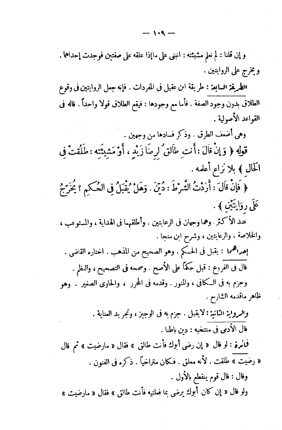 الطَّرِيقَةُ السَّابِعَةُ: طَرِيقَةُ ابْنِ عَقِيلٍ فِي الْمُفْرَدَاتِ، فَإِنَّهُ جَعَلَ الرِّوَايَتَيْنِ فِي وُقُوعِ الطَّلَاقِ بِدُونِ وُجُودِ الصِّفَةِ، فَأَمَّا مَعَ وُجُودِهَا: فَيَقَعُ الطَّلَاقُ قَوْلًا وَاحِدًا، قَالَهُ فِي الْقَوَاعِدِ الْأُصُولِيَّةِ، وَهِيَ أَضْعَفُ الطُّرُقِ وَذَكَرَ فَسَادَهَا مِنْ وَجْهَيْنِ.