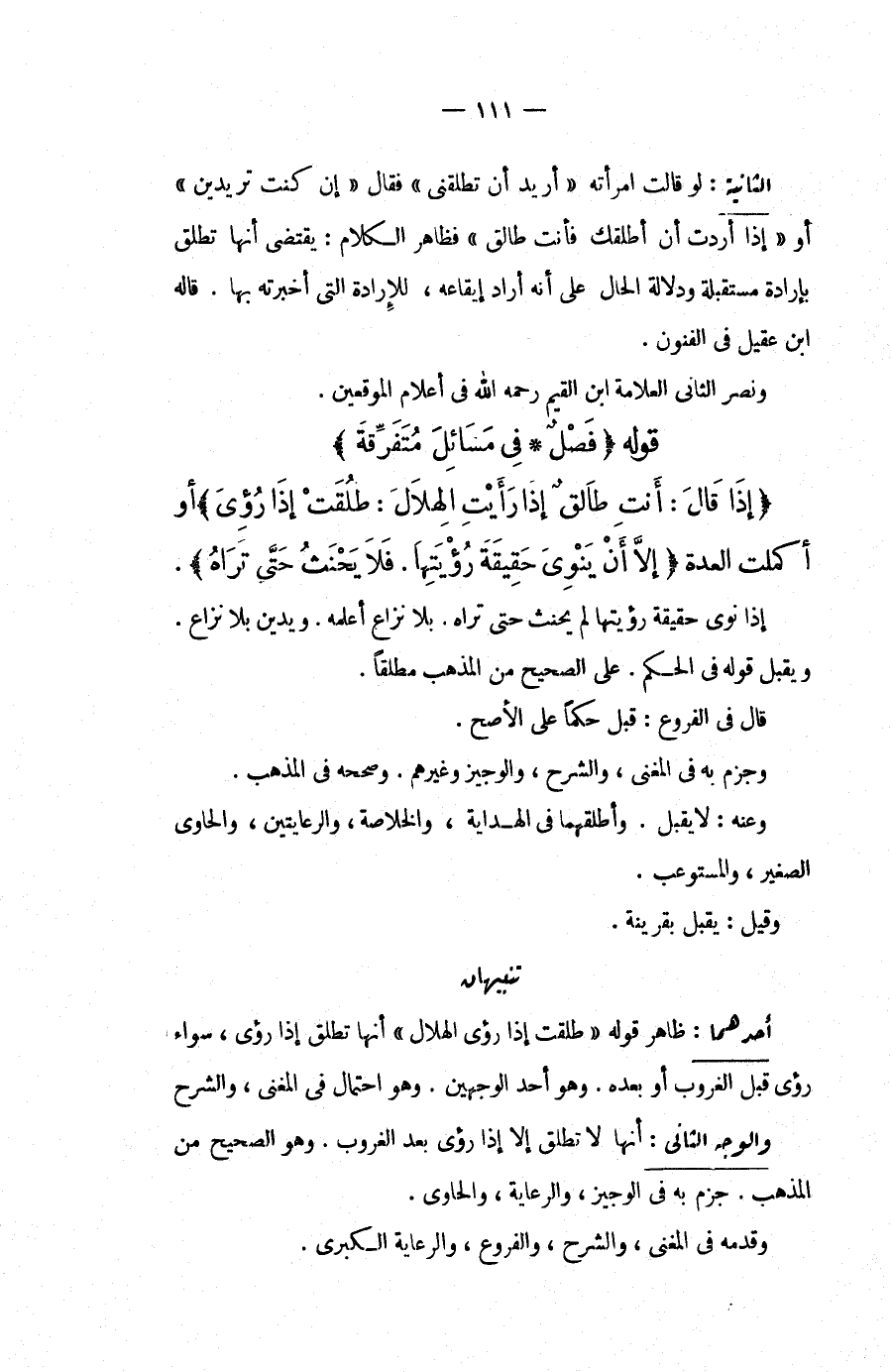 قَوْلُهُ (فَصْلٌ فِي مَسَائِلَ مُتَفَرِّقَةٍ) (إذَا قَالَ: أَنْتِ طَالِقٌ إذَا رَأَيْتِ الْهِلَالَ: طَلُقَتْ إذَا رُئِيَ) أَوْ أَكْمَلَتْ الْعِدَّةَ (إلَّا أَنْ يَنْوِيَ حَقِيقَةَ رُؤْيَتِهَا، فَلَا يَحْنَثُ حَتَّى تَرَاهُ) ، إذَا نَوَى حَقِيقَةَ رُؤْيَتِهَا لَمْ يَحْنَثْ حَتَّى تَرَاهُ، بِلَا نِزَاعٍ أَعْلَمُهُ، وَيُدَيَّنُ بِلَا نِزَاعٍ، وَيُقْبَلُ قَوْلُهُ فِي الْحُكْمِ، عَلَى الصَّحِيحِ مِنْ الْمَذْهَبِ مُطْلَقًا، قَالَ فِي الْفُرُوعِ: قُبِلَ حُكْمًا عَلَى الْأَصَحِّ، وَجَزَمَ بِهِ فِي الْمُغْنِي، وَالشَّرْحِ، وَالْوَجِيزِ وَغَيْرِهِمْ، وَصَحَّحَهُ فِي الْمُذْهَبِ، وَعَنْهُ: لَا يُقْبَلُ، وَأَطْلَقَهُمَا فِي الْهِدَايَةِ، وَالْخُلَاصَةِ، وَالرِّعَايَتَيْنِ، وَالْحَاوِي الصَّغِيرِ، وَالْمُسْتَوْعِبِ، وَقِيلَ: يُقْبَلُ بِقَرِينَةٍ.