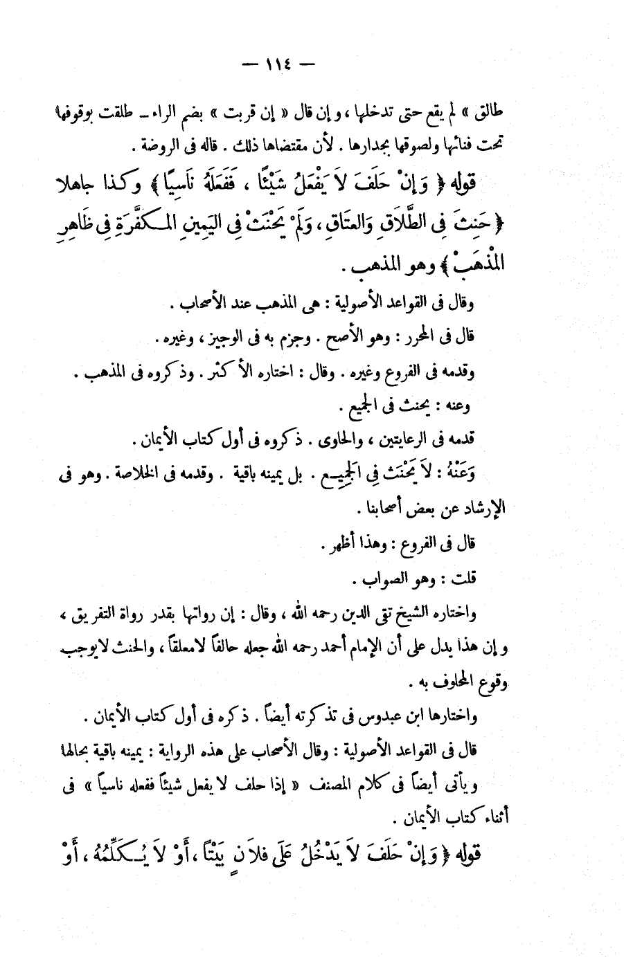 قَوْلُهُ (وَإِنْ) (حَلَفَ لَا يَفْعَلُ شَيْئًا، فَفَعَلَهُ نَاسِيًا) وَكَذَا جَاهِلًا (حَنِثَ فِي الطَّلَاقِ وَالْعَتَاقِ، وَلَمْ يَحْنَثْ فِي الْيَمِينِ الْمُكَفَّرَةِ فِي ظَاهِرِ الْمَذْهَبِ) وَهُوَ الْمَذْهَبُ، وَقَالَ فِي الْقَوَاعِدِ الْأُصُولِيَّةِ: هِيَ الْمَذْهَبُ عِنْدَ الْأَصْحَابِ، قَالَ فِي الْمُحَرَّرِ: وَهُوَ الْأَصَحُّ، وَجَزَمَ بِهِ فِي الْوَجِيزِ، وَغَيْرِهِ، وَقَدَّمَهُ فِي الْفُرُوعِ وَغَيْرِهِ، وَقَالَ: اخْتَارَهُ الْأَكْثَرُ، وَذَكَرُوهُ فِي الْمُذْهَبِ، وَعَنْهُ: يَحْنَثُ فِي الْجَمِيعِ، قَدَّمَهُ فِي الرِّعَايَتَيْنِ، وَالْحَاوِي، ذَكَرُوهُ فِي أَوَّلِ كِتَابِ الْأَيْمَانِ، وَعَنْهُ: لَا يَحْنَثُ فِي الْجَمِيعِ، بَلْ يَمِينُهُ بَاقِيَةٌ، وَقَدَّمَهُ فِي الْخُلَاصَةِ، وَهُوَ فِي الْإِرْشَادِ عَنْ بَعْضِ أَصْحَابِنَا، قَالَ فِي الْفُرُوعِ: وَهَذَا أَظْهَرُ، قُلْتُ: وَهُوَ الصَّوَابُ، وَاخْتَارَهُ الشَّيْخُ تَقِيُّ الدِّينِ - رَحِمَهُ اللَّهُ -، وَقَالَ: إنَّ رُوَاتِهَا بِقَدْرِ رُوَاةِ التَّفْرِيقِ، وَإِنَّ هَذَا يَدُلُّ عَلَى أَنَّ الْإِمَامَ أَحْمَدَ - رَحِمَهُ اللَّهُ - جَعَلَهُ حَالِفًا لَا مُعَلَّقًا، وَالْحِنْثُ لَا يُوجِبُ وُقُوعَ الْمَحْلُوفِ بِهِ، وَاخْتَارَهَا ابْنُ عَبْدُوسٍ فِي تَذْكِرَتِهِ أَيْضًا، ذَكَرَهُ فِي أَوَّلِ كِتَابِ الْأَيْمَانِ، قَالَ فِي الْقَوَاعِدِ الْأُصُولِيَّةِ: وَقَالَ الْأَصْحَابُ عَلَى هَذِهِ الرِّوَايَةِ: يَمِينُهُ بَاقِيَةٌ بِحَالِهَا وَيَأْتِي أَيْضًا فِي كَلَامِ الْمُصَنِّفِ " إذَا حَلَفَ لَا يَفْعَلُ شَيْئًا فَفَعَلَهُ نَاسِيًا " فِي أَثْنَاءِ كِتَابِ الْأَيْمَانِ.