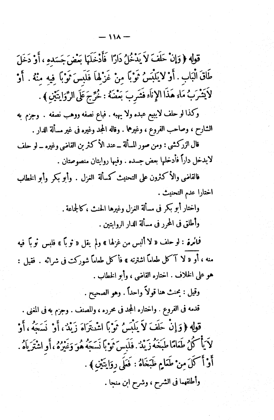 قَوْلُهُ (وَإِنْ حَلَفَ لَا يَدْخُلُ دَارًا فَأَدْخَلَهَا بَعْضَ جَسَدِهِ، أَوْ دَخَلَ طَاقَ الْبَابِ أَوْ لَا يَلْبَسُ ثَوْبًا مِنْ غَزْلِهَا فَلَبِسَ ثَوْبًا فِيهِ مِنْهُ، أَوْ لَا يَشْرَبُ مَاءَ هَذَا الْإِنَاءِ فَشَرِبَ بَعْضَهُ: خُرِّجَ عَلَى الرِّوَايَتَيْنِ) ، وَكَذَا لَوْ حَلَفَ لَا يَبِيعُ عَبْدَهُ وَلَا يَهَبُهُ، فَبَاعَ نِصْفَهُ وَوَهَبَ نِصْفَهُ، وَجَزَمَ بِهِ الشَّارِحُ، وَصَاحِبُ الْفُرُوعِ، وَغَيْرُهُمَا، وَقَالَهُ الْمَجْدُ وَغَيْرُهُ فِي غَيْرِ مَسْأَلَةِ الدَّارِ، قَالَ الزَّرْكَشِيُّ: وَمِنْ صَوَّرَ الْمَسْأَلَةَ عِنْدَ الْأَكْثَرِينَ الْقَاضِي وَغَيْرُهُ لَوْ حَلَفَ لَا يَدْخُلُ دَارًا فَأَدْخَلَهَا بَعْضَ جَسَدِهِ، وَفِيهَا رِوَايَتَانِ مَنْصُوصَتَانِ، فَالْقَاضِي وَالْأَكْثَرُونَ عَلَى التَّحْنِيثِ كَمَسْأَلَةِ الْغَزْلِ، وَأَبُو بَكْرٍ وَأَبُو الْخَطَّابِ اخْتَارَا عَدَمَ التَّحْنِيثِ، وَاخْتَارَ أَبُو بَكْرٍ فِي مَسْأَلَةِ الْغَزْلِ وَغَيْرِهَا الْحِنْثَ، كَالْجَمَاعَةِ، وَأَطْلَقَ فِي الْمُحَرَّرِ فِي مَسْأَلَةِ الدَّارِ الرِّوَايَتَيْنِ.