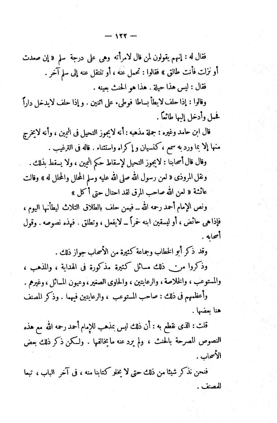 فَقَالَ لَهُ: إنَّهُمْ يَقُولُونَ لِمَنْ قَالَ لِامْرَأَتِهِ وَهِيَ عَلَى دَرَجَةِ سُلَّمٍ " إنْ صَعِدْت أَوْ نَزَلْت فَأَنْتِ طَالِقٌ " فَقَالُوا: تُحْمَلُ عَنْهُ، أَوْ تَنْتَقِلُ عَنْهُ إلَى سُلَّمٍ آخَرَ، فَقَالَ: لَيْسَ هَذَا حِيلَةً، هَذَا هُوَ الْحِنْثُ بِعَيْنِهِ.