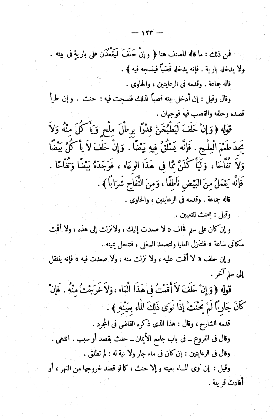 قَوْلُهُ (وَإِنْ حَلَفَ لَيَطْبُخَنَّ قِدْرًا بِرِطْلِ مِلْحٍ وَيَأْكُلُ مِنْهُ وَلَا يَجِدُ طَعْمَ الْمِلْحِ، فَإِنَّهُ يَسْلُقُ فِيهِ بَيْضًا، وَإِنْ حَلَفَ لَا يَأْكُلُ بَيْضًا وَلَا تُفَّاحًا، وَلَيَأْكُلَنَّ مِمَّا فِي هَذَا الْوِعَاءِ، فَوَجَدَهُ بَيْضًا وَتُفَّاحًا، فَإِنَّهُ يَعْمَلُ مِنْ الْبَيْضِ نَاطِفًا، وَمِنْ التُّفَّاحِ شَرَابًا) ، قَالَهُ جَمَاعَةٌ، وَقَدَّمَهُ فِي الرِّعَايَتَيْنِ، وَالْحَاوِي، وَقِيلَ: يَحْنَثُ لِلتَّعْيِينِ، وَإِنْ كَانَ عَلَى سُلَّمٍ فَحَلَفَ " لَا صَعِدْت إلَيْك، وَلَا نَزَلْت إلَى هَذِهِ، وَلَا أَقَمْت مَكَانِي سَاعَةً " فَلْتَنْزِلْ الْعُلْيَا وَلْتَصْعَدْ السُّفْلَى، فَتَنْحَلُّ يَمِينُهُ، وَإِنْ حَلَفَ " لَا أَقَمْت عَلَيْهِ، وَلَا نَزَلْت مِنْهُ، وَلَا صَعِدْت فِيهِ " فَإِنَّهُ يَنْتَقِلُ إلَى سُلَّمٍ آخَرَ. قَوْلُهُ (وَإِنْ حَلَفَ لَا أَقَمْت فِي هَذَا الْمَاءِ، وَلَا خَرَجْت مِنْهُ، فَإِنْ كَانَ جَارِيًا لَمْ يَحْنَثْ إذَا نَوَى ذَلِكَ الْمَاءَ بِعَيْنِهِ) ، قَدَّمَهُ الشَّارِحُ، وَقَالَ: هَذَا الَّذِي ذَكَرَهُ الْقَاضِي فِي الْمُجَرَّدِ، وَقَالَ فِي الْفُرُوعِ فِي بَابِ جَامِعِ الْأَيْمَانِ حَنِثَ بِقَصْدٍ أَوْ سَبَبٍ. انْتَهَى. وَقَالَ فِي الرِّعَايَتَيْنِ: إنْ كَانَ فِي مَاءٍ جَارٍ وَلَا نِيَّةَ لَهُ: لَمْ تَطْلُقْ، وَقِيلَ: إنْ نَوَى الْمَاءَ بِعَيْنِهِ وَإِلَّا حَنِثَ، كَمَا لَوْ قَصَدَ خُرُوجَهَا مِنْ النَّهْرِ، أَوْ أَفَادَتْ قَرِينَةٌ.