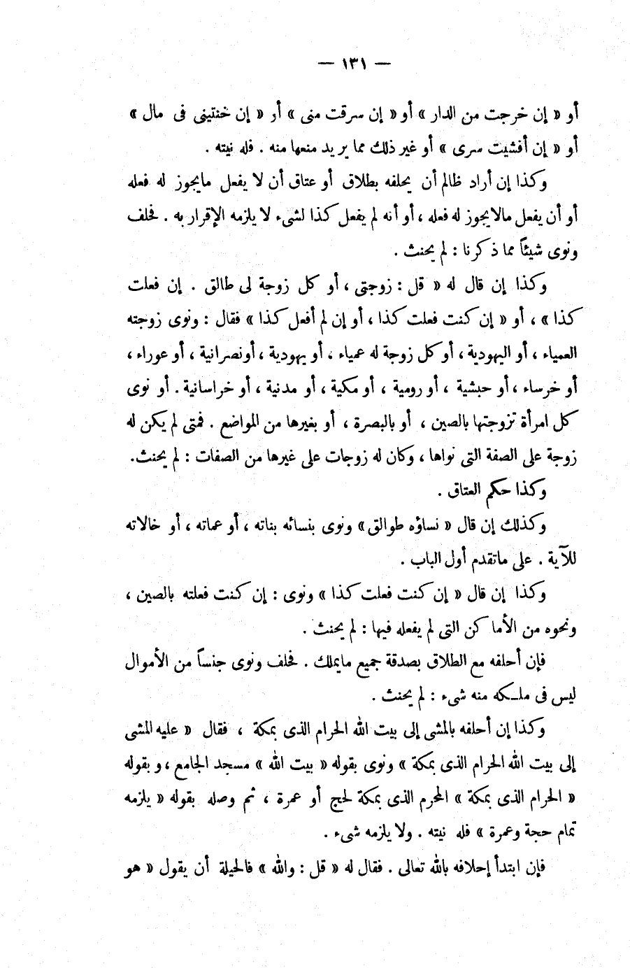 وَكَذَا إنْ أَرَادَ ظَالِمٌ أَنْ يُحَلِّفَهُ بِطَلَاقٍ أَوْ عَتَاقٍ أَنْ لَا يَفْعَلَ مَا يَجُوزُ لَهُ فِعْلُهُ أَوْ أَنْ يَفْعَلَ مَا لَا يَجُوزُ لَهُ فِعْلُهُ، أَوْ أَنَّهُ لَمْ يَفْعَلْ كَذَا لِشَيْءٍ لَا يَلْزَمُهُ الْإِقْرَارُ بِهِ، فَحَلَفَ وَنَوَى شَيْئًا مِمَّا ذَكَرْنَا: لَمْ يَحْنَثْ، وَكَذَا إنْ قَالَ لَهُ " قُلْ: زَوْجَتِي، أَوْ كُلُّ زَوْجَةٍ لِي طَالِقٌ، إنْ فَعَلَتْ كَذَا "، أَوْ " إنْ كُنْت فَعَلْت كَذَا، أَوْ إنْ لَمْ أَفْعَلْ كَذَا " فَقَالَ: وَنَوَى زَوْجَتَهُ الْعَمْيَاءَ، أَوْ الْيَهُودِيَّةَ، أَوْ كُلَّ زَوْجَةٍ لَهُ عَمْيَاءَ، أَوْ يَهُودِيَّةٍ، أَوْ نَصْرَانِيَّةٍ، أَوْ عَوْرَاءَ، أَوْ خَرْسَاءَ، أَوْ حَبَشِيَّةٍ، أَوْ رُومِيَّةٍ، أَوْ مَكِّيَّةً، أَوْ مَدَنِيَّةٍ، أَوْ خُرَاسَانِيَّةٍ، أَوْ نَوَى كُلَّ امْرَأَةٍ تَزَوَّجْتهَا بِالصِّينِ، أَوْ بِالْبَصْرَةِ، أَوْ بِغَيْرِهَا مِنْ الْمَوَاضِعِ، فَمَتَى لَمْ يَكُنْ لَهُ زَوْجَةٌ عَلَى الصِّفَةِ الَّتِي نَوَاهَا، وَكَانَ لَهُ زَوْجَاتٌ عَلَى غَيْرِهَا مِنْ الصِّفَاتِ: لَمْ يَحْنَثْ. وَكَذَا حُكْمُ الْعَتَاقِ، وَكَذَلِكَ إنْ قَالَ " نِسَاؤُهُ طَوَالِقُ " وَنَوَى بِنِسَائِهِ بَنَاتِهِ، أَوْ عَمَّاتِهِ، أَوْ خَالَاتِهِ لِلْآيَةِ، عَلَى مَا تَقَدَّمَ أَوَّلَ الْبَابِ، وَكَذَا إنْ قَالَ " إنْ كُنْت فَعَلْت كَذَا " وَنَوَى: إنْ كُنْت فَعَلْته بِالصِّينِ، وَنَحْوِهِ مِنْ الْأَمَاكِنِ الَّتِي لَمْ يَفْعَلْهُ فِيهَا: لَمْ يَحْنَثْ، فَإِنْ أَحْلَفَهُ مَعَ الطَّلَاقِ بِصَدَقَةِ جَمِيعِ مَا يَمْلِكُ، فَحَلَفَ وَنَوَى جِنْسًا مِنْ الْأَمْوَالِ لَيْسَ فِي مِلْكِهِ مِنْهُ شَيْءٌ: لَمْ يَحْنَثْ، وَكَذَا إنْ أَحْلَفَهُ بِالْمَشْيِ إلَى بَيْتِ اللَّهِ الْحَرَامِ الَّذِي بِمَكَّةَ، فَقَالَ " عَلَيْهِ الْمَشْيُ إلَى بَيْتِ اللَّهِ الْحَرَامِ الَّذِي بِمَكَّةَ " وَنَوَى بِقَوْلِهِ " بَيْتُ اللَّهِ " مَسْجِدَ الْجَامِعِ، وَبِقَوْلِهِ " الْحَرَامِ الَّذِي بِمَكَّةَ " الْمُحْرِمَ الَّذِي بِمَكَّةَ لِحَجٍّ أَوْ عَمْرَةٍ، ثُمَّ وَصَلَهُ بِقَوْلِهِ " يَلْزَمُهُ تَمَامُ حِجَّةٍ وَعُمْرَةٍ " فَلَهُ نِيَّتُهُ، وَلَا يَلْزَمُهُ شَيْءٌ.