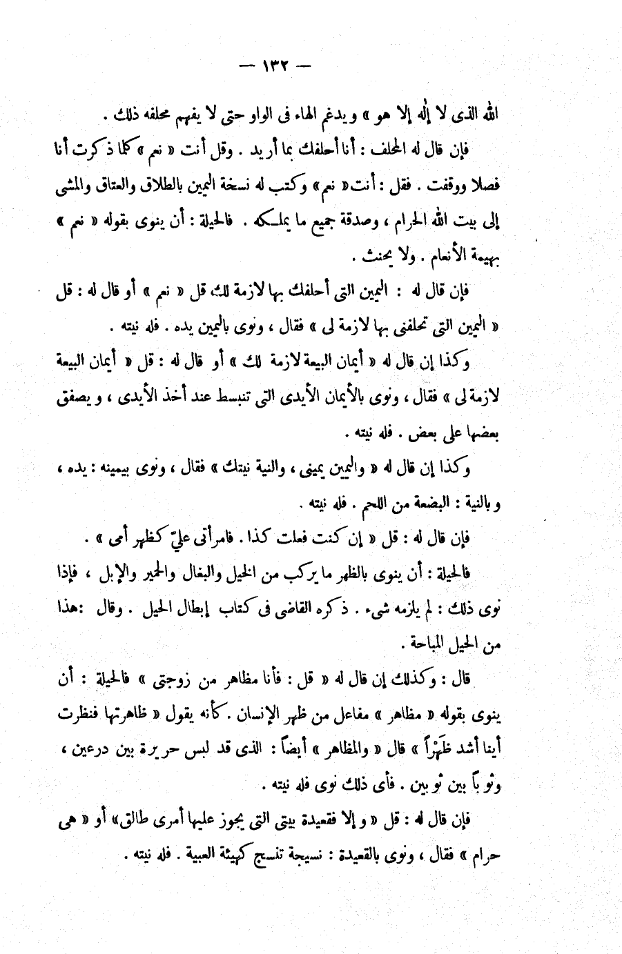اللَّهُ الَّذِي لَا إلَهَ إلَّا هُوَ " وَيُدْغِمُ الْهَاءَ فِي الْوَاوِ حَتَّى لَا يَفْهَمَ مُحَلِّفُهُ ذَلِكَ، فَإِنْ قَالَ لَهُ الْمُحَلِّفُ: أَنَا أَحْلِفُك بِمَا أُرِيدُ، وَقُلْ أَنْتَ " نَعَمْ " كُلَّمَا ذَكَرْت أَنَا فَصْلًا وَوَقَفْت، فَقُلْ: أَنْتَ " نَعَمْ " وَكَتَبَ لَهُ نُسْخَةَ الْيَمِينِ بِالطَّلَاقِ وَالْعَتَاقِ وَالْمَشْيِ إلَى بَيْتِ اللَّهِ الْحَرَامِ، وَصَدَقَةِ جَمِيعِ مَا يَمْلِكُهُ، فَالْحِيلَةُ: أَنْ يَنْوِيَ بِقَوْلِهِ " نَعَمْ " بَهِيمَةُ الْأَنْعَامِ، وَلَا يَحْنَثُ، فَإِنْ قَالَ لَهُ: الْيَمِينُ الَّتِي أُحَلِّفُك بِهَا لَازِمَةٌ لَك قُلْ " نَعَمْ " أَوْ قَالَ لَهُ: قُلْ " الْيَمِينُ الَّتِي تُحَلِّفُنِي بِهَا لَازِمَةٌ لِي " فَقَالَ، وَنَوَى بِالْيَمِينِ يَدَهُ، فَلَهُ نِيَّتُهُ، وَكَذَا إنْ قَالَ لَهُ " أَيْمَانُ الْبَيْعَةِ لَازِمَةٌ لَك " أَوْ قَالَ لَهُ: قُلْ " أَيْمَانُ الْبَيْعَةِ لَازِمَةٌ لِي " فَقَالَ، وَنَوَى بِالْأَيْمَانِ الْأَيْدِي الَّتِي تَنْبَسِطُ عِنْدَ أَخْذِ الْأَيْدِي، وَيُصَفِّقُ بَعْضُهَا عَلَى بَعْضٍ، فَلَهُ نِيَّتُهُ، وَكَذَا إنْ قَالَ لَهُ " وَالْيَمِينُ يَمِينِي، وَالنِّيَّةُ نِيَّتُك " فَقَالَ، وَنَوَى بِيَمِينِهِ: يَدَهُ، وَبِالنِّيَّةِ: الْبِضْعَةَ مِنْ اللَّحْمِ، فَلَهُ نِيَّتُهُ، فَإِنْ قَالَ لَهُ: قُلْ " إنْ كُنْت فَعَلْت كَذَا، فَامْرَأَتِي عَلَيَّ كَظَهْرِ أُمِّي "، فَالْحِيلَةُ: أَنْ يَنْوِيَ بِالظَّهْرِ مَا يُرْكَبُ مِنْ الْخَيْلِ وَالْبِغَالِ وَالْحَمِيرِ وَالْإِبِلِ، فَإِذَا نَوَى ذَلِكَ: لَمْ يَلْزَمْهُ شَيْءٌ.