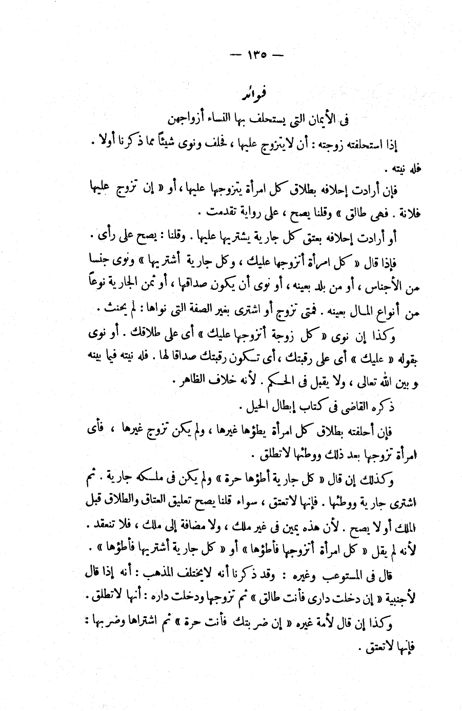 فَوَائِدُ فِي الْأَيْمَانِ الَّتِي يَسْتَحْلِفُ بِهَا النِّسَاءُ أَزْوَاجَهُنَّ إذَا اسْتَحْلَفَتْهُ زَوْجَتُهُ: أَنْ لَا يَتَزَوَّجَ عَلَيْهَا، فَحَلَفَ وَنَوَى شَيْئًا مِمَّا ذَكَرْنَا أَوَّلًا، فَلَهُ نِيَّتُهُ، فَإِنْ أَرَادَتْ إحْلَافَهُ بِطَلَاقِ كُلِّ امْرَأَةٍ يَتَزَوَّجُهَا عَلَيْهَا، أَوْ " إنْ تَزَوَّجَ عَلَيْهَا فُلَانَةَ، فَهِيَ طَالِقٌ " وَقُلْنَا يَصِحُّ، عَلَى رِوَايَةٍ تَقَدَّمَتْ، أَوْ أَرَادَتْ إحْلَافَهُ بِعِتْقِ كُلِّ جَارِيَةٍ يَشْتَرِيهَا عَلَيْهَا، وَقُلْنَا: يَصِحُّ عَلَى رَأْيٍ، فَإِذَا قَالَ " كُلُّ امْرَأَةٍ أَتَزَوَّجُهَا عَلَيْك، وَكُلُّ جَارِيَةٍ أَشْتَرِيهَا " وَنَوَى جِنْسًا مِنْ الْأَجْنَاسِ، أَوْ مِنْ بَلَدٍ بِعَيْنِهِ، أَوْ نَوَى أَنْ يَكُونَ صَدَاقُهَا، أَوْ ثَمَنُ الْجَارِيَةِ نَوْعًا مِنْ أَنْوَاعِ الْمَالِ بِعَيْنِهِ، فَمَتَى تَزَوَّجَ أَوْ اشْتَرَى بِغَيْرِ الصِّفَةِ الَّتِي نَوَاهَا: لَمْ يَحْنَثْ، وَكَذَا إنْ نَوَى " كُلَّ زَوْجَةٍ أَتَزَوَّجُهَا عَلَيْك " أَيْ عَلَى طَلَاقِك، أَوْ نَوَى بِقَوْلِهِ " عَلَيْك " أَيْ عَلَى رَقَبَتِك، أَيْ تَكُونُ رَقَبَتُك صَدَاقًا لَهَا، فَلَهُ نِيَّتُهُ فِيمَا بَيْنَهُ وَبَيْنَ اللَّهِ تَعَالَى، وَلَا يُقْبَلُ فِي الْحُكْم؛ لِأَنَّهُ خِلَافُ الظَّاهِرِ، ذَكَرَهُ الْقَاضِي فِي كِتَابِ إبْطَالِ الْحِيَلِ، فَإِنْ أَحَلَفْته بِطَلَاقِ كُلِّ امْرَأَةٍ يَطَؤُهَا غَيْرَهَا، وَلَمْ يَكُنْ تَزَوَّجَ غَيْرَهَا، فَأَيُّ امْرَأَةٍ تَزَوَّجَهَا بَعْدَ ذَلِكَ وَوَطِئَهَا لَا تَطْلُقُ، وَكَذَلِكَ إنْ قَالَ " كُلُّ جَارِيَةٍ أَطَؤُهَا حُرَّةٌ " وَلَمْ يَكُنْ فِي مِلْكِهِ جَارِيَةٌ، ثُمَّ اشْتَرَى جَارِيَةً وَوَطِئَهَا، فَإِنَّهَا لَا تُعْتَقُ، سَوَاءٌ قُلْنَا يَصِحُّ تَعْلِيقُ الْعَتَاقِ وَالطَّلَاقِ قَبْلَ الْمِلْكِ أَوْ لَا يَصِحُّ؛ لِأَنَّ هَذِهِ يَمِينٌ فِي غَيْرِ مِلْكٍ، وَلَا مُضَافَةٌ إلَى مِلْكٍ، فَلَا تَنْعَقِدُ؛ لِأَنَّهُ لَمْ يَقُلْ " كُلُّ امْرَأَةٍ أَتَزَوَّجُهَا فَأَطَؤُهَا " أَوْ " كُلُّ جَارِيَةٍ أَشْتَرِيهَا فَأَطَؤُهَا ".