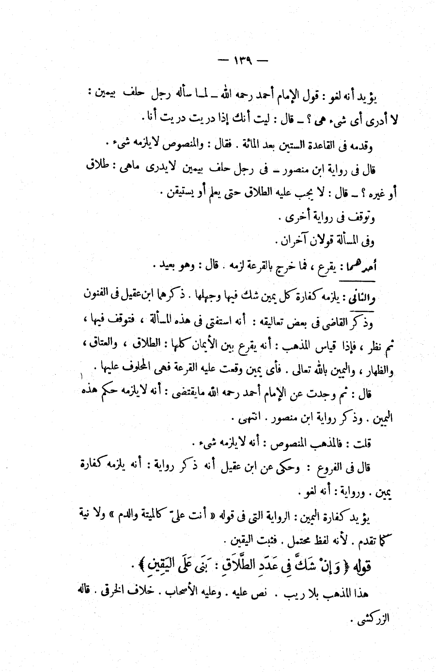 يُؤَيِّدُ أَنَّهُ لَغْوٌ: قَوْلُ الْإِمَامِ أَحْمَدَ - رَحِمَهُ اللَّهُ - لَمَّا سَأَلَهُ رَجُلٌ حَلَفَ بِيَمِينٍ: لَا أَدْرِي أَيَّ شَيْءٍ هِيَ؟ قَالَ: لَيْتَ أَنَّك إذَا دَرَيْت دَرَيْت أَنَا، وَقَدَّمَهُ فِي الْقَاعِدَةِ السِّتِّينَ بَعْدَ الْمِائَةِ، فَقَالَ: وَالْمَنْصُوصُ لَا يَلْزَمُهُ شَيْءٌ، قَالَ فِي رِوَايَةِ ابْنِ مَنْصُورٍ فِي رَجُلٍ حَلَفَ بِيَمِينٍ لَا يَدْرِي مَا هِيَ: طَلَاقٌ أَوْ غَيْرُهُ؟ قَالَ: لَا يَجِبُ عَلَيْهِ الطَّلَاقُ حَتَّى يَعْلَمَ أَوْ يَسْتَيْقِنَ، وَتَوَقَّفَ فِي رِوَايَةٍ أُخْرَى، وَفِي الْمَسْأَلَةِ قَوْلَانِ آخَرَانِ، أَحَدُهُمَا: يُقْرَعُ، فَمَا خَرَجَ بِالْقُرْعَةِ لَزِمَهُ، قَالَ: وَهُوَ بَعِيدٌ، وَالثَّانِي: يَلْزَمُهُ كَفَّارَةُ كُلِّ يَمِينٍ شَكَّ فِيهَا وَجَهِلَهَا، ذَكَرَهُمَا ابْنُ عَقِيلٍ فِي الْفُنُونِ وَذَكَرَ الْقَاضِي فِي بَعْضِ تَعَالِيقِهِ: أَنَّهُ اُسْتُفْتِيَ فِي هَذِهِ الْمَسْأَلَةِ، فَتَوَقَّفَ فِيهَا، ثُمَّ نَظَرَ، فَإِذَا قِيَاسُ الْمَذْهَبِ: أَنَّهُ يُقْرَعُ بَيْنَ الْأَيْمَانِ كُلِّهَا: الطَّلَاقِ، وَالْعَتَاقِ، وَالظِّهَارِ، وَالْيَمِينِ بِاَللَّهِ تَعَالَى، فَأَيُّ يَمِينٍ وَقَعَتْ عَلَيْهِ الْقُرْعَةُ فَهِيَ الْمَحْلُوفُ عَلَيْهَا، قَالَ: ثُمَّ وَجَدْت عَنْ الْإِمَامِ أَحْمَدَ - رَحِمَهُ اللَّهُ - مَا يَقْتَضِي: أَنَّهُ لَا يَلْزَمُهُ حُكْمُ هَذِهِ الْيَمِينِ، وَذَكَرَ رِوَايَةَ ابْنِ مَنْصُورٍ. انْتَهَى. قُلْتُ: فَالْمَذْهَبُ الْمَنْصُوصُ: أَنَّهُ لَا يَلْزَمُهُ شَيْءٌ، قَالَ فِي الْفُرُوعِ: وَحُكِيَ عَنْ ابْنِ عَقِيلٍ أَنَّهُ ذَكَرَ رِوَايَةً: أَنَّهُ يَلْزَمُهُ كَفَّارَةُ يَمِينٍ، وَرِوَايَةُ: أَنَّهُ لَغْوٌ، يُؤَيِّدُ كَفَّارَةَ الْيَمِينِ: الرِّوَايَةُ الَّتِي فِي قَوْلِهِ " أَنْتِ عَلَيَّ كَالْمَيْتَةِ وَالدَّمِ " وَلَا نِيَّةَ كَمَا تَقَدَّمَ؛ لِأَنَّهُ لَفْظٌ مُحْتَمَلٌ، فَثَبَتَ الْيَقِينُ.