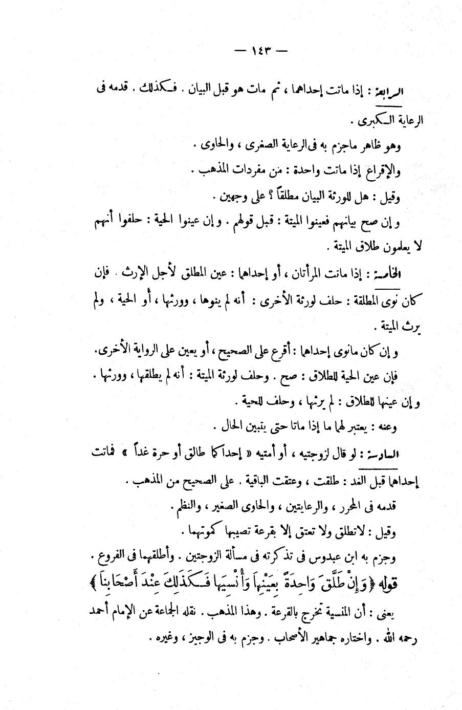 الرَّابِعَةُ: إذَا مَاتَتْ إحْدَاهُمَا، ثُمَّ مَاتَ هُوَ قَبْلَ الْبَيَانِ، فَكَذَلِكَ، قَدَّمَهُ فِي الرِّعَايَةِ الْكُبْرَى، وَهُوَ ظَاهِرُ مَا جَزَمَ بِهِ فِي الرِّعَايَةِ الصُّغْرَى، وَالْحَاوِي، وَالْإِقْرَاعُ إذَا مَاتَتْ وَاحِدَةٌ: مِنْ مُفْرَدَاتِ الْمَذْهَبِ، وَقِيلَ: هَلْ لِلْوَرَثَةِ الْبَيَانُ مُطْلَقًا؟ عَلَى وَجْهَيْنِ، وَإِنْ صَحَّ بَيَانُهُمْ فَعَيَّنُوا الْمَيِّتَةَ: قَبِلَ قَوْلِهِمْ، وَإِنْ عَيَّنُوا الْحَيَّةَ: حَلَفُوا أَنَّهُمْ لَا يَعْلَمُونَ طَلَاقَ الْمَيِّتَةِ، الْخَامِسَةُ: إذَا مَاتَتْ الْمَرْأَتَانِ، أَوْ إحْدَاهُمَا: عُيِّنَ الْمُطَلَّقُ لِأَجَلِ الْإِرْثِ، فَإِنْ كَانَ نَوَى الْمُطَلَّقَةَ: حَلَفَ لِوَرَثَةِ الْأُخْرَى: أَنَّهُ لَمْ يَنْوِهَا، وَوَرِثَهَا، أَوْ الْحَيَّةَ، وَلَمْ يَرِثْ الْمَيِّتَةَ، وَإِنْ كَانَ مَا نَوَى إحْدَاهُمَا: أَقْرَعَ عَلَى الصَّحِيحِ، أَوْ يُعَيِّنُ عَلَى الرِّوَايَةِ الْأُخْرَى، فَإِنَّ عَيَّنَ الْحَيَّةَ لِلطَّلَاقِ: صَحَّ، وَحَلَفَ لِوَرَثَةِ الْمَيِّتَةِ: أَنَّهُ لَمْ يُطَلِّقْهَا، وَوَرِثَهَا، وَإِنْ عَيَّنَهَا لِلطَّلَاقِ: لَمْ يَرِثْهَا، وَحَلَفَ لِلْحَيَّةِ، وَعَنْهُ: يُعْتَبَرُ لَهُمَا مَا إذَا مَاتَا حَتَّى يَتَبَيَّنَ الْحَالُ.
