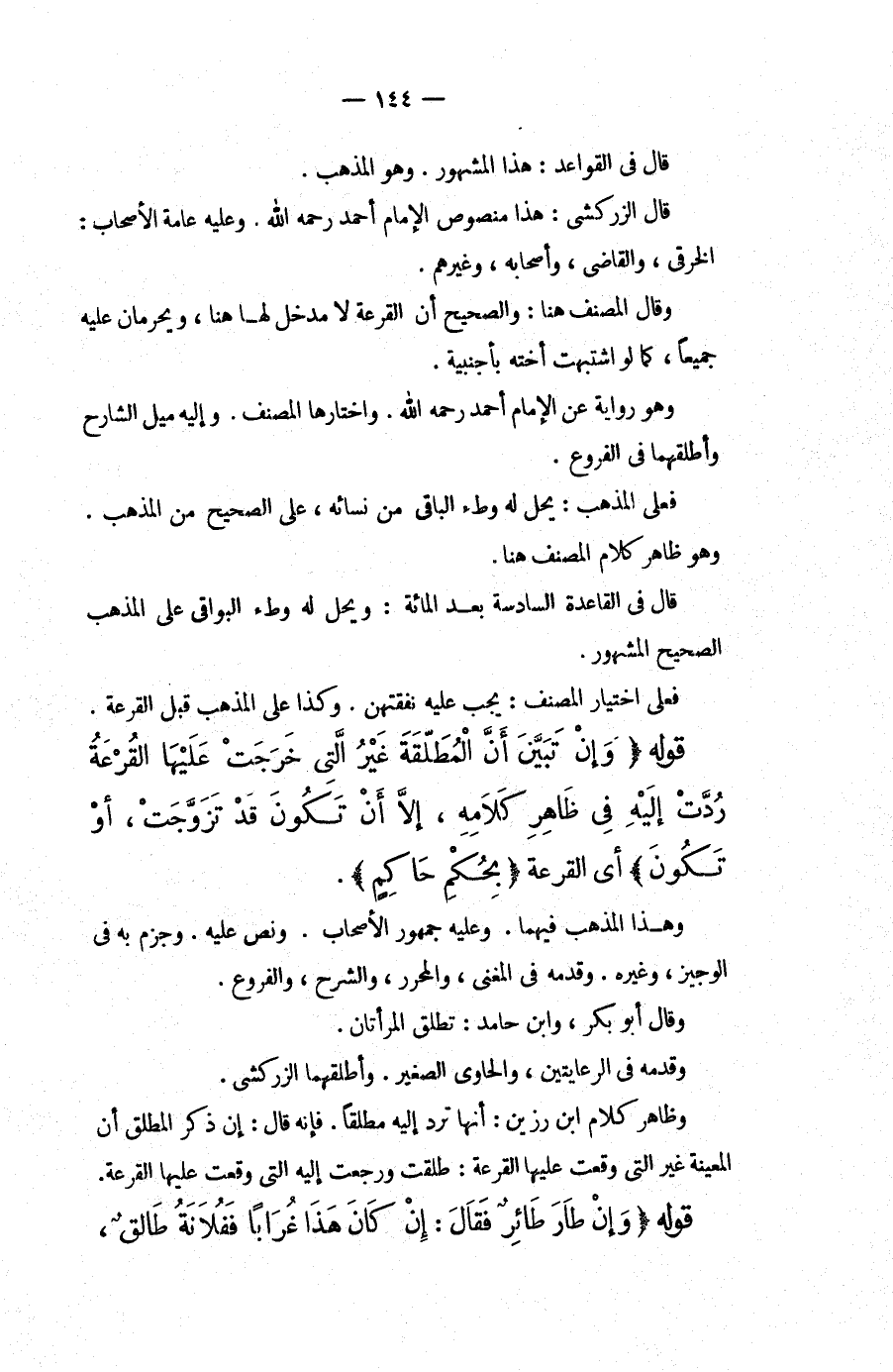 قَالَ فِي الْقَوَاعِدِ: هَذَا الْمَشْهُورُ، وَهُوَ الْمَذْهَبُ، قَالَ الزَّرْكَشِيُّ: هَذَا مَنْصُوصُ الْإِمَامِ أَحْمَدَ - رَحِمَهُ اللَّهُ -، وَعَلَيْهِ عَامَّةُ الْأَصْحَابِ: الْخِرَقِيُّ، وَالْقَاضِي، وَأَصْحَابُهُ، وَغَيْرُهُمْ، وَقَالَ الْمُصَنِّفُ هُنَا: وَالصَّحِيحُ أَنَّ الْقُرْعَةَ لَا مَدْخَلَ لَهَا هُنَا، وَيَحْرُمَانِ عَلَيْهِ جَمِيعًا. كَمَا لَوْ اشْتَبَهَتْ أُخْتُهُ بِأَجْنَبِيَّةٍ، وَهُوَ رِوَايَةٌ عَنْ الْإِمَامِ أَحْمَدَ - رَحِمَهُ اللَّهُ -، وَاخْتَارَهَا الْمُصَنِّفُ، وَإِلَيْهِ مَيْلُ الشَّارِحِ وَأَطْلَقَهُمَا فِي الْفُرُوعِ، فَعَلَى الْمَذْهَبِ: يَحِلُّ لَهُ وَطْءُ الْبَاقِي مِنْ نِسَائِهِ، عَلَى الصَّحِيحِ مِنْ الْمَذْهَبِ، وَهُوَ ظَاهِرُ كَلَامِ الْمُصَنِّفِ هُنَا، قَالَ فِي الْقَاعِدَةِ السَّادِسَةِ بَعْدَ الْمِائَةِ: وَيَحِلُّ لَهُ وَطْءُ الْبَوَاقِي عَلَى الْمَذْهَبِ الصَّحِيحِ الْمَشْهُورِ، فَعَلَى اخْتِيَارِ الْمُصَنِّفِ: يَجِبُ عَلَيْهِ نَفَقَتُهُنَّ، وَكَذَا عَلَى الْمَذْهَبِ قَبْلَ الْقُرْعَةِ. قَوْلُهُ (وَإِنْ تَبَيَّنَ أَنَّ الْمُطَلَّقَةَ غَيْرُ الَّتِي خَرَجَتْ عَلَيْهَا الْقُرْعَةُ رُدَّتْ إلَيْهِ فِي ظَاهِرِ كَلَامِهِ، إلَّا أَنْ تَكُونَ قَدْ تَزَوَّجَتْ، أَوْ تَكُونَ) أَيْ الْقُرْعَةُ (بِحُكْمِ حَاكِمٍ) ، وَهَذَا الْمَذْهَبُ فِيهِمَا، وَعَلَيْهِ جُمْهُورُ الْأَصْحَابِ، وَنَصَّ عَلَيْهِ، وَجَزَمَ بِهِ فِي الْوَجِيزِ، وَغَيْرِهِ، وَقَدَّمَهُ فِي الْمُغْنِي، وَالْمُحَرَّرِ، وَالشَّرْحِ، وَالْفُرُوعِ، وَقَالَ أَبُو بَكْرٍ، وَابْنُ حَامِدٍ: تَطْلُقُ الْمَرْأَتَانِ، وَقَدَّمَهُ فِي الرِّعَايَتَيْنِ، وَالْحَاوِي الصَّغِيرِ، وَأَطْلَقَهُمَا الزَّرْكَشِيُّ، وَظَاهِرُ كَلَامِ ابْنِ رَزِينٍ: أَنَّهَا تُرَدُّ إلَيْهِ مُطْلَقًا، فَإِنَّهُ قَالَ: إنْ ذَكَرَ الْمُطَلِّقُ أَنَّ الْمُعَيَّنَةَ غَيْرُ الَّتِي وَقَعَتْ عَلَيْهَا الْقُرْعَةُ: طَلُقَتْ وَرَجَعَتْ إلَيْهِ الَّتِي وَقَعَتْ عَلَيْهَا الْقُرْعَةُ.