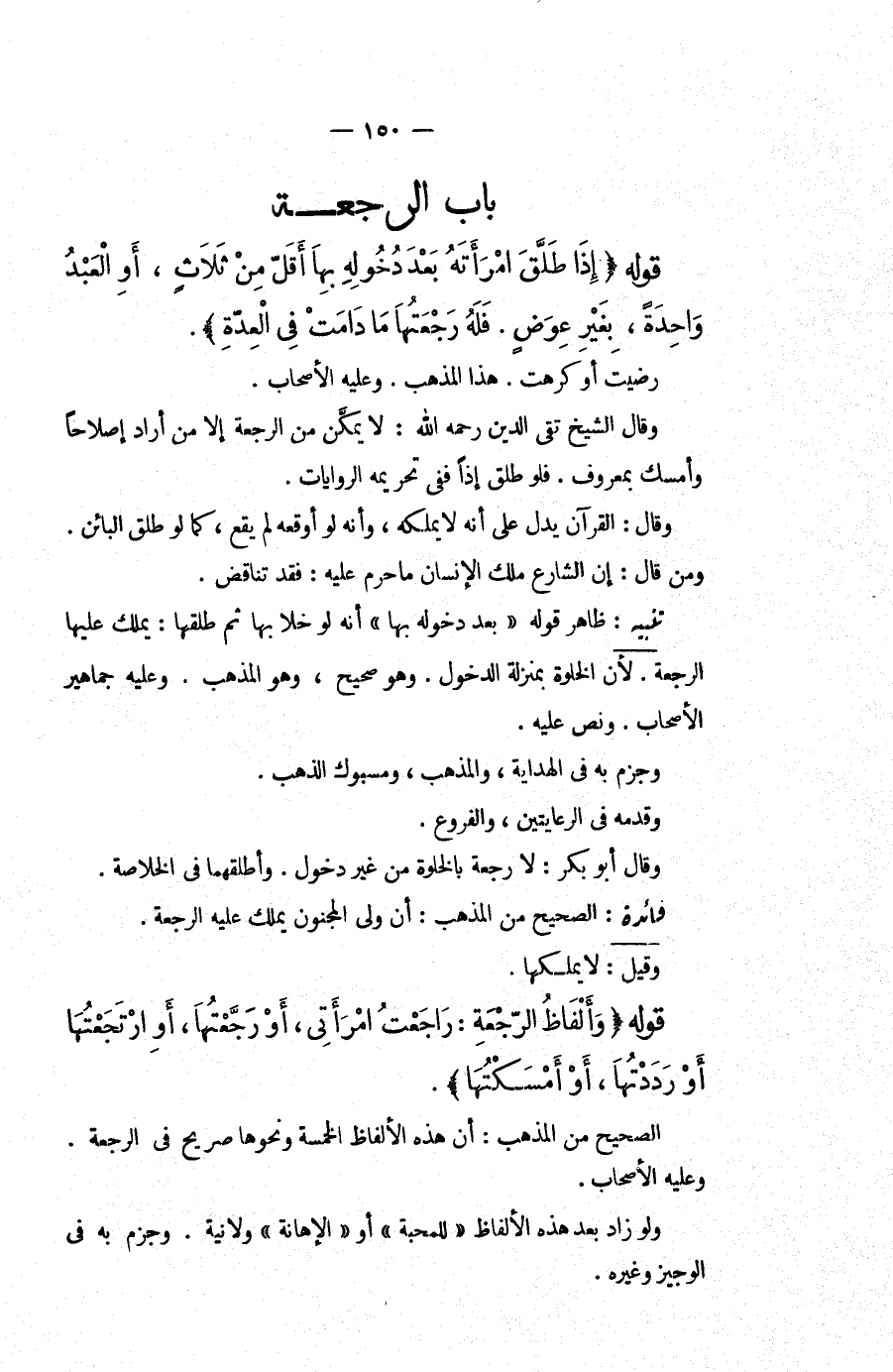 ِ قَوْلُهُ (إذَا طَلَّقَ امْرَأَتَهُ بَعْدَ دُخُولِهِ بِهَا أَقَلَّ مِنْ ثَلَاثٍ، أَوْ الْعَبْدُ وَاحِدَةً، بِغَيْرِ عِوَضٍ، فَلَهُ رَجْعَتُهَا مَا دَامَتْ فِي الْعِدَّةِ) ، رَضِيَتْ أَوْ كَرِهَتْ، هَذَا الْمَذْهَبُ، وَعَلَيْهِ الْأَصْحَابُ، وَقَالَ الشَّيْخُ تَقِيُّ الدِّينِ - رَحِمَهُ اللَّهُ -: لَا يُمَكَّنُ مِنْ الرَّجْعَةِ إلَّا مَنْ أَرَادَ إصْلَاحًا وَأَمْسَكَ بِمَعْرُوفٍ، فَلَوْ طَلَّقَ إذًا فَفِي تَحْرِيمِهِ الرِّوَايَاتُ، وَقَالَ: الْقُرْآنُ يَدُلُّ عَلَى أَنَّهُ لَا يَمْلِكُهُ، وَأَنَّهُ لَوْ أَوْقَعَهُ لَمْ يَقَعْ، كَمَا لَوْ طَلَّقَ الْبَائِنَ، وَمَنْ قَالَ: إنَّ الشَّارِعَ مَلَّكَ الْإِنْسَانَ مَا حَرُمَ عَلَيْهِ: فَقَدْ تَنَاقَضَ.