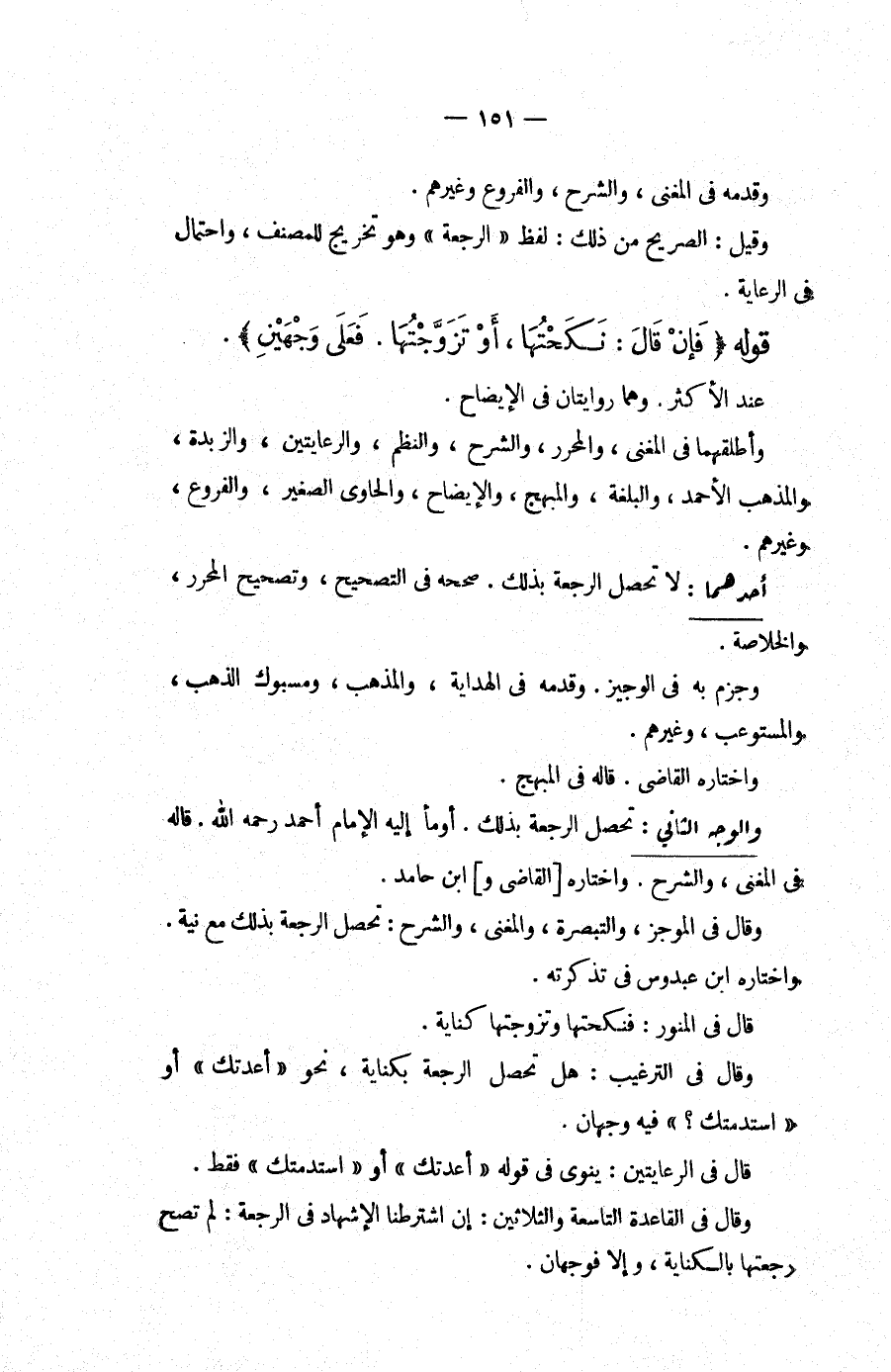 وَقَدَّمَهُ فِي الْمُغْنِي، وَالشَّرْحِ، وَالْفُرُوعِ وَغَيْرِهِمْ، وَقِيلَ: الصَّرِيحُ مِنْ ذَلِكَ: لَفْظُ " الرَّجْعَةِ " وَهُوَ تَخْرِيجٌ لِلْمُصَنِّفِ، وَاحْتِمَالٌ فِي الرِّعَايَةِ، قَوْلُهُ (فَإِنْ قَالَ: نَكَحْتهَا، أَوْ تَزَوَّجْتهَا، فَعَلَى وَجْهَيْنِ) ، عِنْدَ الْأَكْثَرِ، وَهُمَا رِوَايَتَانِ فِي الْإِيضَاحِ، وَأَطْلَقَهُمَا فِي الْمُغْنِي، وَالْمُحَرَّرِ، وَالشَّرْحِ، وَالنَّظْمِ، وَالرِّعَايَتَيْنِ، وَالزُّبْدَةِ، وَالْمَذْهَبِ الْأَحْمَدِ، وَالْبُلْغَةِ، وَالْمُبْهِجِ، وَالْإِيضَاحِ، وَالْحَاوِي الصَّغِيرِ، وَالْفُرُوعِ، وَغَيْرِهِمْ. أَحَدُهُمَا: لَا تَحْصُلُ الرَّجْعَةُ بِذَلِكَ، صَحَّحَهُ فِي التَّصْحِيحِ، وَتَصْحِيحِ الْمُحَرَّرِ، وَالْخُلَاصَةِ، وَجَزَمَ بِهِ فِي الْوَجِيزِ، وَقَدَّمَهُ فِي الْهِدَايَةِ، وَالْمُذْهَبِ، وَمَسْبُوكِ الذَّهَبِ، وَالْمُسْتَوْعِبِ، وَغَيْرِهِمْ، وَاخْتَارَهُ الْقَاضِي، قَالَهُ فِي الْمُبْهِجِ. وَالْوَجْهُ الثَّانِي: تَحْصُلُ الرَّجْعَةُ بِذَلِكَ، أَوْمَأَ إلَيْهِ الْإِمَامُ أَحْمَدُ - رَحِمَهُ اللَّهُ -، قَالَهُ فِي الْمُغْنِي، وَالشَّرْحِ، وَاخْتَارَهُ [الْقَاضِي] وَابْنُ حَامِدٍ، وَقَالَ فِي الْمُوجِزِ، وَالتَّبْصِرَةِ، وَالْمُغْنِي، وَالشَّرْحِ: تَحْصُلُ الرَّجْعَةُ بِذَلِكَ مَعَ نِيَّةٍ، وَاخْتَارَهُ ابْنُ عَبْدُوسٍ فِي تَذْكِرَتِهِ، قَالَ فِي الْمُنَوِّرِ: فَنَكَحْتهَا وَتَزَوَّجْتهَا كِنَايَةٌ، وَقَالَ فِي التَّرْغِيبِ: هَلْ تَحْصُلُ الرَّجْعَةُ بِكِنَايَةٍ، نَحْوَ " أَعَدْتُك " أَوْ " اسْتَدَمْتُكِ؟ " فِيهِ وَجْهَانِ، قَالَ فِي الرِّعَايَتَيْنِ: يَنْوِي فِي قَوْلِهِ " أَعَدْتُك " أَوْ " اسْتَدَمْتُكِ " فَقَطْ، وَقَالَ فِي الْقَاعِدَةِ التَّاسِعَةِ وَالثَّلَاثِينَ: إنَّ اشْتَرَطْنَا الْإِشْهَادَ فِي الرَّجْعَةِ: لَمْ تَصِحَّ رَجْعَتُهَا بِالْكِنَايَةِ، وَإِلَّا فَوَجْهَانِ،