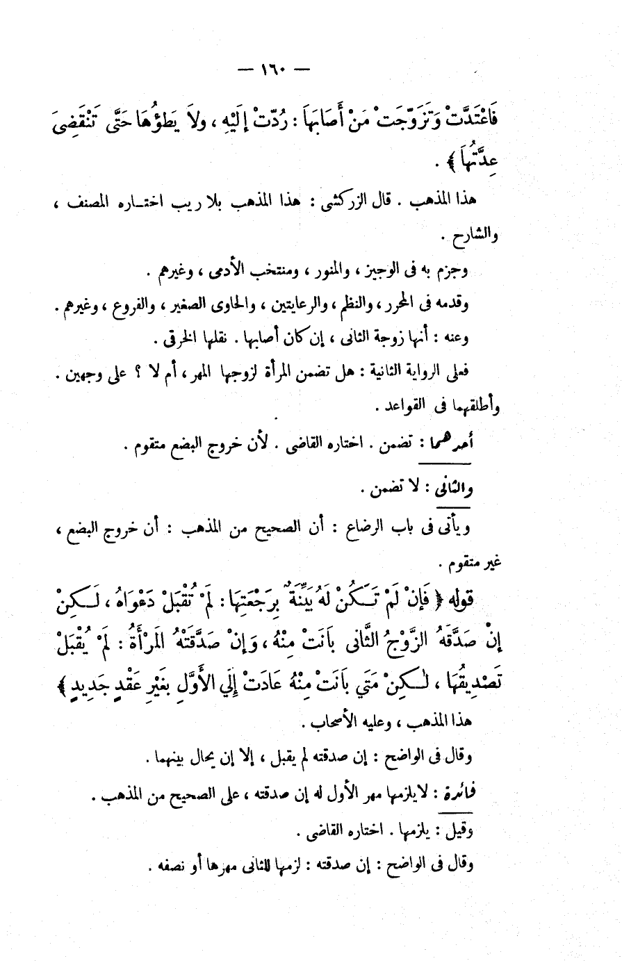 فَاعْتَدَّتْ وَتَزَوَّجَتْ مَنْ أَصَابَهَا: رُدَّتْ إلَيْهِ، وَلَا يَطَؤُهَا حَتَّى تَنْقَضِيَ عِدَّتُهَا) ، هَذَا الْمَذْهَبُ، قَالَ الزَّرْكَشِيُّ: هَذَا الْمَذْهَبُ بِلَا رَيْبٍ اخْتَارَهُ الْمُصَنِّفُ، وَالشَّارِحُ، وَجَزَمَ بِهِ فِي الْوَجِيزِ، وَالْمُنَوِّرِ، وَمُنْتَخَبِ الْأَدَمِيِّ، وَغَيْرِهِمْ، وَقَدَّمَهُ فِي الْمُحَرَّرِ، وَالنَّظْمِ، وَالرِّعَايَتَيْنِ، وَالْحَاوِي الصَّغِيرِ، وَالْفُرُوعِ، وَغَيْرِهِمْ، وَعَنْهُ: أَنَّهَا زَوْجَةُ الثَّانِي، إنْ كَانَ أَصَابَهَا، نَقَلَهَا الْخِرَقِيُّ، فَعَلَى الرِّوَايَةِ الثَّانِيَةِ: هَلْ تَضْمَنُ الْمَرْأَةُ لِزَوْجِهَا الْمَهْرَ، أَمْ لَا؟ عَلَى وَجْهَيْنِ، وَأَطْلَقَهُمَا فِي الْقَوَاعِدِ. أَحَدُهُمَا: تَضْمَنُ، اخْتَارَهُ الْقَاضِي؛ لِأَنَّ خُرُوجَ الْبِضْعِ مُتَقَوِّمٌ. وَالثَّانِي: لَا تَضْمَنُ، وَيَأْتِي فِي بَابِ الرَّضَاعِ: أَنَّ الصَّحِيحَ مِنْ الْمَذْهَبِ: أَنَّ خُرُوجَ الْبُضْعِ غَيْرُ مُتَقَوِّمٍ.