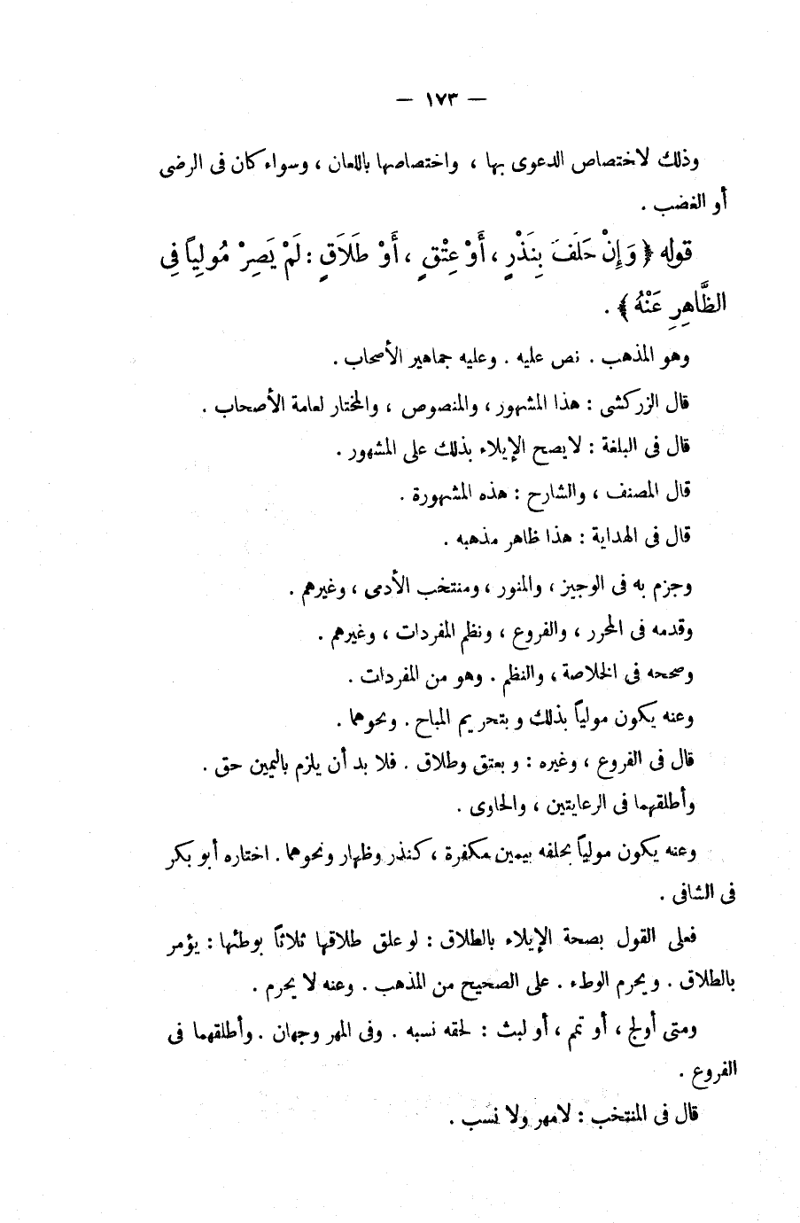وَذَلِكَ لِاخْتِصَاصِ الدَّعْوَى بِهَا، وَاخْتِصَاصِهَا بِاللِّعَانِ، وَسَوَاءٌ كَانَ فِي الرِّضَا أَوْ الْغَضَبِ. قَوْلُهُ (وَإِنْ حَلَفَ بِنَذْرٍ، أَوْ عِتْقٍ، أَوْ طَلَاقٍ: لَمْ يَصِرْ مُولِيًا فِي الظَّاهِرِ عَنْهُ) ، وَهُوَ الْمَذْهَبُ، نَصَّ عَلَيْهِ، وَعَلَيْهِ جَمَاهِيرُ الْأَصْحَابِ، قَالَ الزَّرْكَشِيُّ: هَذَا الْمَشْهُورُ، وَالْمَنْصُوصُ، وَالْمُخْتَارُ لِعَامَّةِ الْأَصْحَابِ، قَالَ فِي الْبُلْغَةِ: لَا يَصِحُّ الْإِيلَاءُ بِذَلِكَ عَلَى الْمَشْهُورِ، قَالَ الْمُصَنِّفُ، وَالشَّارِحُ: هَذِهِ الْمَشْهُورَةُ، قَالَ فِي الْهِدَايَةِ: هَذَا ظَاهِرُ مَذْهَبِهِ، وَجَزَمَ بِهِ فِي الْوَجِيزِ، وَالْمُنَوِّرِ، وَمُنْتَخَبِ الْأَدَمِيِّ، وَغَيْرِهِمْ، وَقَدَّمَهُ فِي الْمُحَرَّرِ، وَالْفُرُوعِ، وَنَظْمِ الْمُفْرَدَاتِ، وَغَيْرِهِمْ، وَصَحَّحَهُ فِي الْخُلَاصَةِ، وَالنَّظْمِ، وَهُوَ مِنْ الْمُفْرَدَاتِ، وَعَنْهُ يَكُونُ مُولِيًا بِذَلِكَ وَبِتَحْرِيمِ الْمُبَاحِ، وَنَحْوِهِمَا، قَالَ فِي الْفُرُوعِ، وَغَيْرِهِ: وَبِعِتْقٍ وَطَلَاقٍ، فَلَا بُدَّ أَنْ يَلْزَمَ بِالْيَمِينِ حَقٌّ، وَأَطْلَقَهُمَا فِي الرِّعَايَتَيْنِ، وَالْحَاوِي، وَعَنْهُ يَكُونُ مُولِيًا بِحَلْفِهِ بِيَمِينٍ مُكَفَّرَةٍ، كَنَذْرٍ وَظِهَارٍ وَنَحْوِهِمَا، اخْتَارَهُ أَبُو بَكْرٍ فِي الشَّافِي، فَعَلَى الْقَوْلِ بِصِحَّةِ الْإِيلَاءِ بِالطَّلَاقِ: لَوْ عَلَّقَ طَلَاقَهَا ثَلَاثًا بِوَطْئِهَا: يُؤْمَرُ بِالطَّلَاقِ، وَيَحْرُمُ الْوَطْءُ، عَلَى الصَّحِيحِ مِنْ الْمَذْهَبِ، وَعَنْهُ لَا يَحْرُمُ، وَمَتَى أَوْلَجَ، أَوْ تَمَّمَ، أَوْ لَبِثَ: لَحِقَهُ نَسَبُهُ، وَفِي الْمَهْرِ وَجْهَانِ، وَأَطْلَقَهُمَا فِي الْفُرُوعِ، قَالَ فِي الْمُنْتَخَبِ: لَا مَهْرَ وَلَا نَسَبَ،