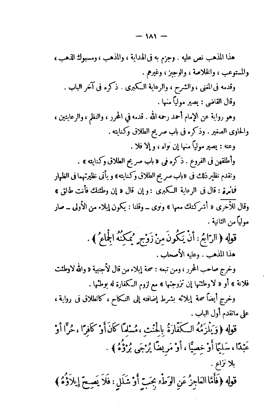 هَذَا الْمَذْهَبُ نَصَّ عَلَيْهِ، وَجَزَمَ بِهِ فِي الْهِدَايَةِ، وَالْمُذْهَبِ، وَمَسْبُوكِ الذَّهَبِ، وَالْمُسْتَوْعِبِ، وَالْخُلَاصَةِ، وَالْوَجِيزِ، وَغَيْرِهِمْ، وَقَدَّمَهُ فِي الْمُغْنِي، وَالشَّرْحِ، وَالرِّعَايَةِ الْكُبْرَى، ذَكَرَهُ فِي آخِرِ الْبَابِ، وَقَالَ الْقَاضِي: يَصِيرُ مُولِيًا مِنْهَا، وَهُوَ رِوَايَةٌ عَنْ الْإِمَامِ أَحْمَدَ - رَحِمَهُ اللَّهُ -، قَدَّمَهُ فِي الْمُحَرَّرِ، وَالنَّظْمِ، وَالرِّعَايَتَيْنِ، وَالْحَاوِي الصَّغِيرِ، وَذَكَرَهُ فِي بَابِ صَرِيحِ الطَّلَاقِ وَكِنَايَتِهِ، وَعَنْهُ: يَصِيرُ مُولِيًا مِنْهَا إنْ نَوَاهُ، وَإِلَّا فَلَا، وَأَطْلَقَهُنَّ فِي الْفُرُوعِ، ذَكَرَهُ فِي " بَابِ صَرِيحِ الطَّلَاقِ وَكِنَايَتِهِ "، وَتَقَدَّمَ نَظِيرُ ذَلِكَ فِي " بَابِ صَرِيحِ الطَّلَاقِ وَكِنَايَتِهِ " وَيَأْتِي نَظِيرَتُهُمَا فِي الظِّهَارِ. فَائِدَةٌ: