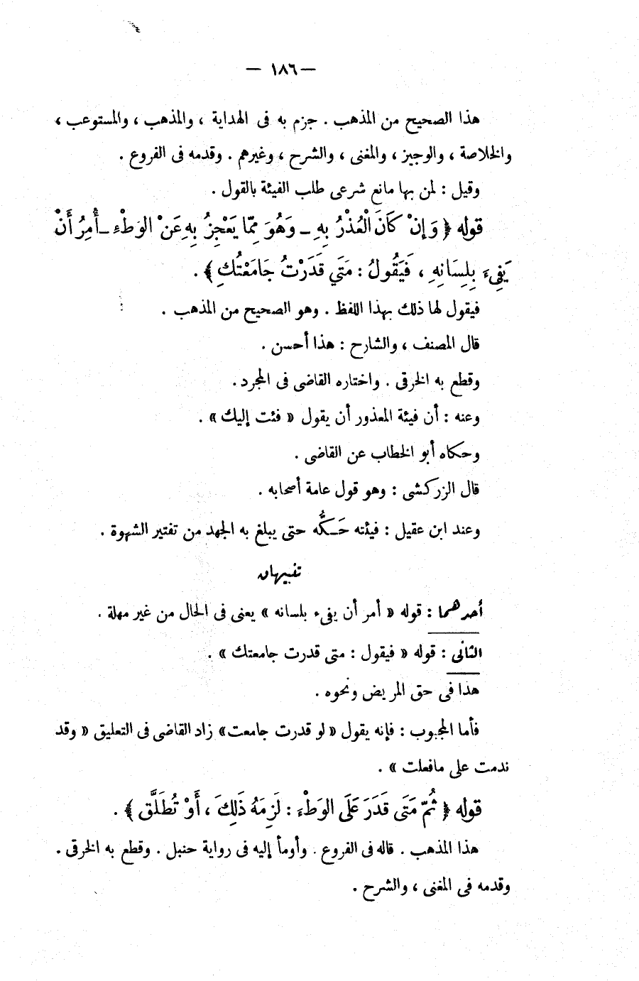 أَحَدُهُمَا: قَوْلُهُ " أَمَرَ أَنْ يَفِيءَ بِلِسَانِهِ " يَعْنِي فِي الْحَالِ مِنْ غَيْرِ مُهْلَةٍ. الثَّانِي: قَوْلُهُ " فَيَقُولُ: مَتَى قَدَرْت جَامَعْتُك "، هَذَا فِي حَقِّ الْمَرِيضِ وَنَحْوِهِ، فَأَمَّا الْمَجْبُوبُ: فَإِنَّهُ يَقُولُ " لَوْ قَدَرْت جَامَعْت " زَادَ الْقَاضِي فِي التَّعْلِيقِ " وَقَدْ نَدِمْت عَلَى مَا فَعَلْت "، قَوْلُهُ (ثُمَّ) (مَتَى قَدَرَ عَلَى الْوَطْءِ: لَزِمَهُ ذَلِكَ، أَوْ تَطْلُقُ) ، هَذَا الْمَذْهَبُ، قَالَهُ فِي الْفُرُوعِ، وَأَوْمَأَ إلَيْهِ فِي رِوَايَةِ حَنْبَلٍ، وَقَطَعَ بِهِ الْخِرَقِيُّ، وَقَدَّمَهُ فِي الْمُغْنِي، وَالشَّرْحِ،