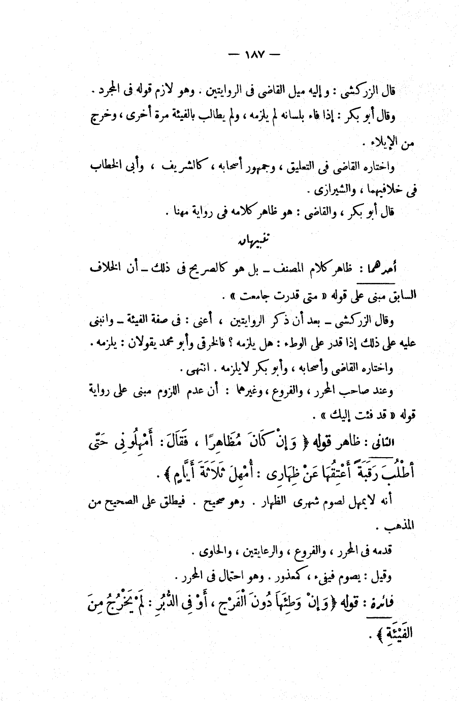 قَالَ الزَّرْكَشِيُّ: وَإِلَيْهِ مَيْلُ الْقَاضِي فِي الرِّوَايَتَيْنِ، وَهُوَ لَازِمُ قَوْلِهِ فِي الْمُجَرَّدِ، وَقَالَ أَبُو بَكْرٍ: إذَا فَاءَ بِلِسَانِهِ لَمْ يَلْزَمْهُ، وَلَمْ يُطَالَبْ بِالْفَيْئَةِ مَرَّةً أُخْرَى، وَخَرَجَ مِنْ الْإِيلَاءِ، وَاخْتَارَهُ الْقَاضِي فِي التَّعْلِيقِ، وَجُمْهُورُ أَصْحَابِهِ، كَالشَّرِيفِ، وَأَبِي الْخَطَّابِ فِي خِلَافَيْهِمَا، وَالشِّيرَازِيِّ، قَالَ أَبُو بَكْرٍ، وَالْقَاضِي: هُوَ ظَاهِرُ كَلَامِهِ فِي رِوَايَةِ مُهَنَّا.