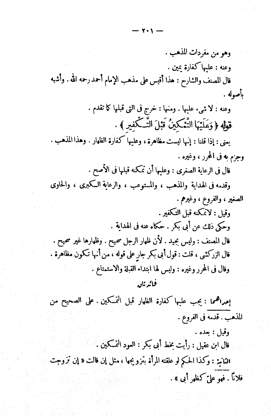 وَهُوَ مِنْ مُفْرَدَاتِ الْمَذْهَبِ. وَعَنْهُ: عَلَيْهَا كَفَّارَةُ يَمِينٍ، قَالَ الْمُصَنِّفُ وَالشَّارِحُ: هَذَا أَقَيْسُ عَلَى مَذْهَبِ الْإِمَامِ أَحْمَدَ - رَحِمَهُ اللَّهُ -، وَأَشْبَهُ بِأُصُولِهِ، وَعَنْهُ: لَا شَيْءَ عَلَيْهَا، وَمِنْهَا: خَرَّجَ فِي الَّتِي قَبْلَهَا كَمَا تَقَدَّمَ. قَوْلُهُ (وَعَلَيْهَا التَّمْكِينُ قَبْلَ التَّكْفِيرِ) ، يَعْنِي: إذَا قُلْنَا: إنَّهَا لَيْسَتْ مُظَاهِرَةً، وَعَلَيْهَا كَفَّارَةُ الظِّهَارِ، وَهَذَا الْمَذْهَبُ، وَجَزَمَ بِهِ فِي الْمُحَرَّرِ، وَغَيْرِهِ، قَالَ فِي الرِّعَايَةِ الصُّغْرَى: وَعَلَيْهَا أَنْ تُمَكِّنَهُ قَبْلَهَا فِي الْأَصَحِّ، وَقَدَّمَهُ فِي الْهِدَايَةِ وَالْمُذْهَبِ، وَالْمُسْتَوْعِبِ، وَالرِّعَايَةِ الْكُبْرَى، وَالْحَاوِي الصَّغِيرِ، وَالْفُرُوعِ، وَغَيْرِهِمْ، وَقِيلَ: لَا تُمَكِّنُهُ قَبْلَ التَّكْفِيرِ، وَحَكَى ذَلِكَ عَنْ أَبِي بَكْرٍ، حَكَاهُ عَنْهُ فِي الْهِدَايَةِ، قَالَ الْمُصَنِّفُ: وَلَيْسَ بِجَيِّدٍ؛ لِأَنَّ ظِهَارَ الرَّجُلِ صَحِيحٌ، وَظِهَارُهَا غَيْرُ صَحِيحٍ، قَالَ الزَّرْكَشِيُّ، قُلْت: قَوْلُ أَبِي بَكْرٍ جَارٍ عَلَى قَوْلِهِ، مِنْ أَنَّهَا تَكُونُ مُظَاهِرَةً، وَقَالَ فِي الْمُحَرَّرِ وَغَيْرِهِ: وَلَيْسَ لَهَا ابْتِدَاءً الْقُبْلَةُ وَالِاسْتِمْتَاعُ.