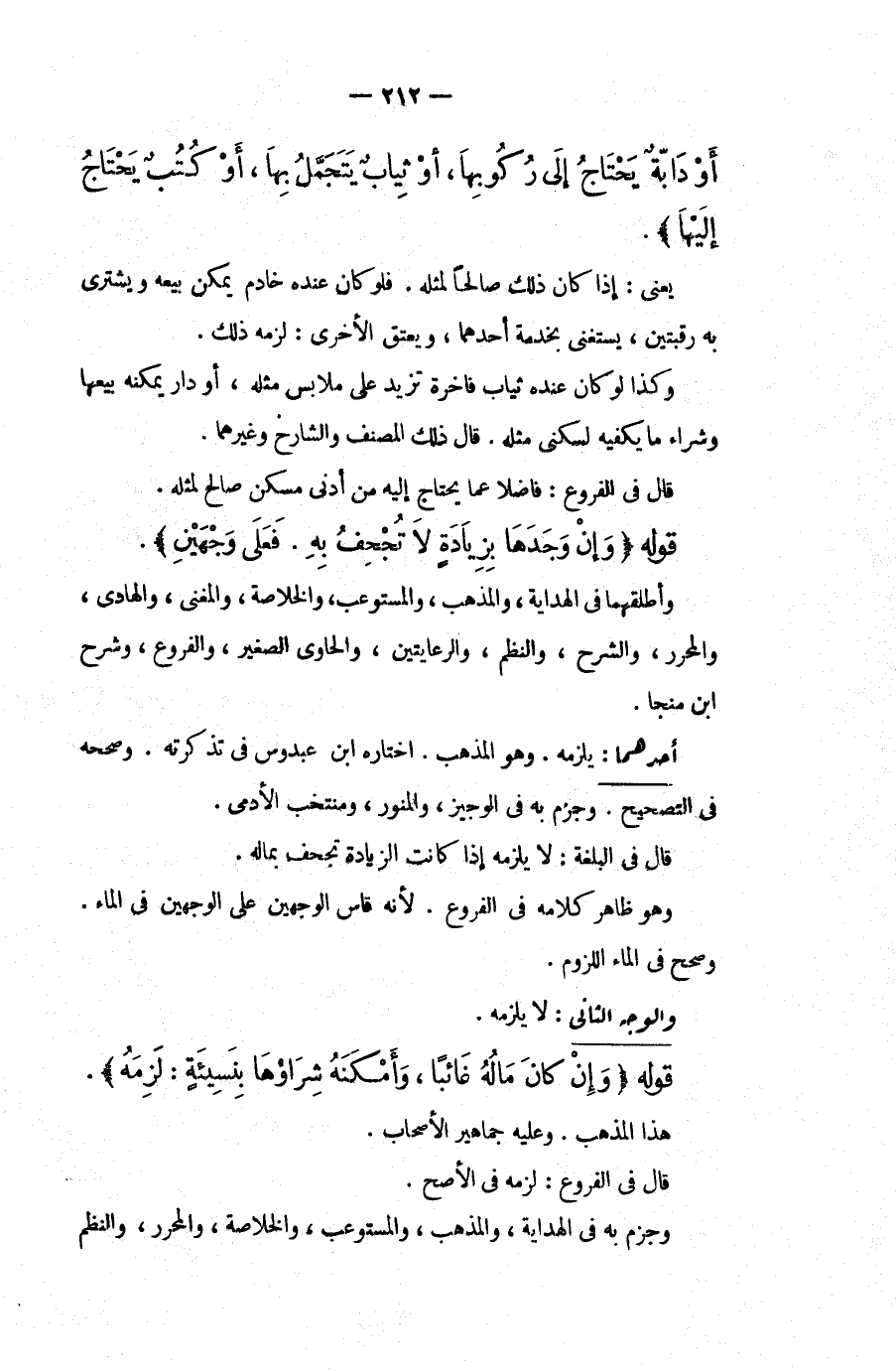 أَوْ دَابَّةٌ يَحْتَاجُ إلَى رُكُوبِهَا، أَوْ ثِيَابٌ يَتَجَمَّلُ بِهَا، أَوْ كُتُبٌ يَحْتَاجُ إلَيْهَا) ، يَعْنِي: إذَا كَانَ ذَلِكَ صَالِحًا لِمِثْلِهِ، فَلَوْ كَانَ عِنْدَهُ خَادِمٌ يُمْكِنُ بَيْعُهُ وَيَشْتَرِي بِهِ رَقَبَتَيْنِ، يَسْتَغْنِي بِخِدْمَةِ أَحَدِهِمَا، وَيَعْتِقُ الْأُخْرَى: لَزِمَهُ ذَلِكَ، وَكَذَا لَوْ كَانَ عِنْدَهُ ثِيَابٌ فَاخِرَةٌ تَزِيدُ عَلَى مَلَابِسِ مِثْلِهِ، أَوْ دَارٌ يُمْكِنُهُ بَيْعُهَا وَشِرَاءُ مَا يَكْفِيه لِسُكْنَى مِثْلِهِ، قَالَ ذَلِكَ الْمُصَنِّفُ وَالشَّارِحُ وَغَيْرُهُمَا، قَالَ فِي الْفُرُوعِ: فَاضِلًا عَمَّا يَحْتَاجُ إلَيْهِ مِنْ أَدْنَى مَسْكَنٍ صَالِحٍ لِمِثْلِهِ.