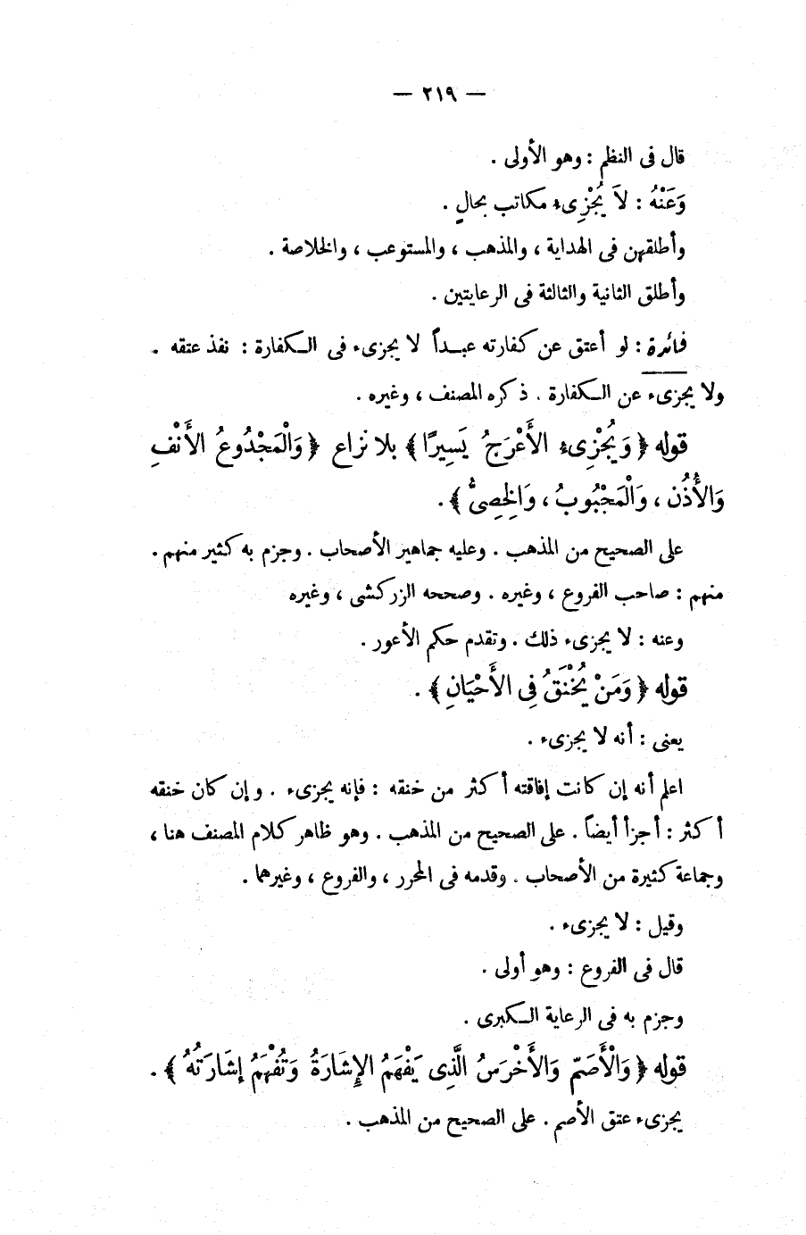 لَوْ أَعْتَقَ عَنْ كَفَّارَتِهِ عَبْدًا لَا يُجْزِئُ فِي الْكَفَّارَةِ: نَفَذَ عِتْقُهُ، وَلَا يُجْزِئُ عَنْ الْكَفَّارَةِ، ذَكَرَهُ الْمُصَنِّفُ، وَغَيْرُهُ. قَوْلُهُ (وَيُجْزِئُ الْأَعْرَجُ يَسِيرًا) بِلَا نِزَاعٍ (وَالْمَجْدُوعُ الْأَنْفِ وَالْأُذُنِ، وَالْمَجْبُوبُ، وَالْخَصِيُّ) ، عَلَى الصَّحِيحِ مِنْ الْمَذْهَبِ، وَعَلَيْهِ جَمَاهِيرُ الْأَصْحَابِ، وَجَزَمَ بِهِ كَثِيرٌ مِنْهُمْ، مِنْهُمْ: صَاحِبُ الْفُرُوعِ، وَغَيْرُهُ، وَصَحَّحَهُ الزَّرْكَشِيُّ، وَغَيْرُهُ وَعَنْهُ: لَا يُجْزِئُ ذَلِكَ، وَتَقَدَّمَ حُكْمُ الْأَعْوَرِ. قَوْلُهُ (وَمَنْ يُخْنَقُ فِي الْأَحْيَانِ) ، يَعْنِي: أَنَّهُ لَا يُجْزِئُ، اعْلَمْ أَنَّهُ إنْ كَانَتْ إفَاقَتُهُ أَكْثَرَ مِنْ خَنْقِهِ: فَإِنَّهُ يُجْزِئُ، وَإِنْ كَانَ خَنْقُهُ أَكْثَرَ: أَجْزَأَ أَيْضًا، عَلَى الصَّحِيحِ مِنْ الْمَذْهَبِ، وَهُوَ ظَاهِرُ كَلَامِ الْمُصَنِّفِ هُنَا، وَجَمَاعَةٍ كَثِيرَةٍ مِنْ الْأَصْحَابِ، وَقَدَّمَهُ فِي الْمُحَرَّرِ، وَالْفُرُوعِ، وَغَيْرِهِمَا، وَقِيلَ: لَا يُجْزِئُ، قَالَ فِي الْفُرُوعِ: وَهُوَ أَوْلَى، وَجَزَمَ بِهِ فِي الرِّعَايَةِ الْكُبْرَى.