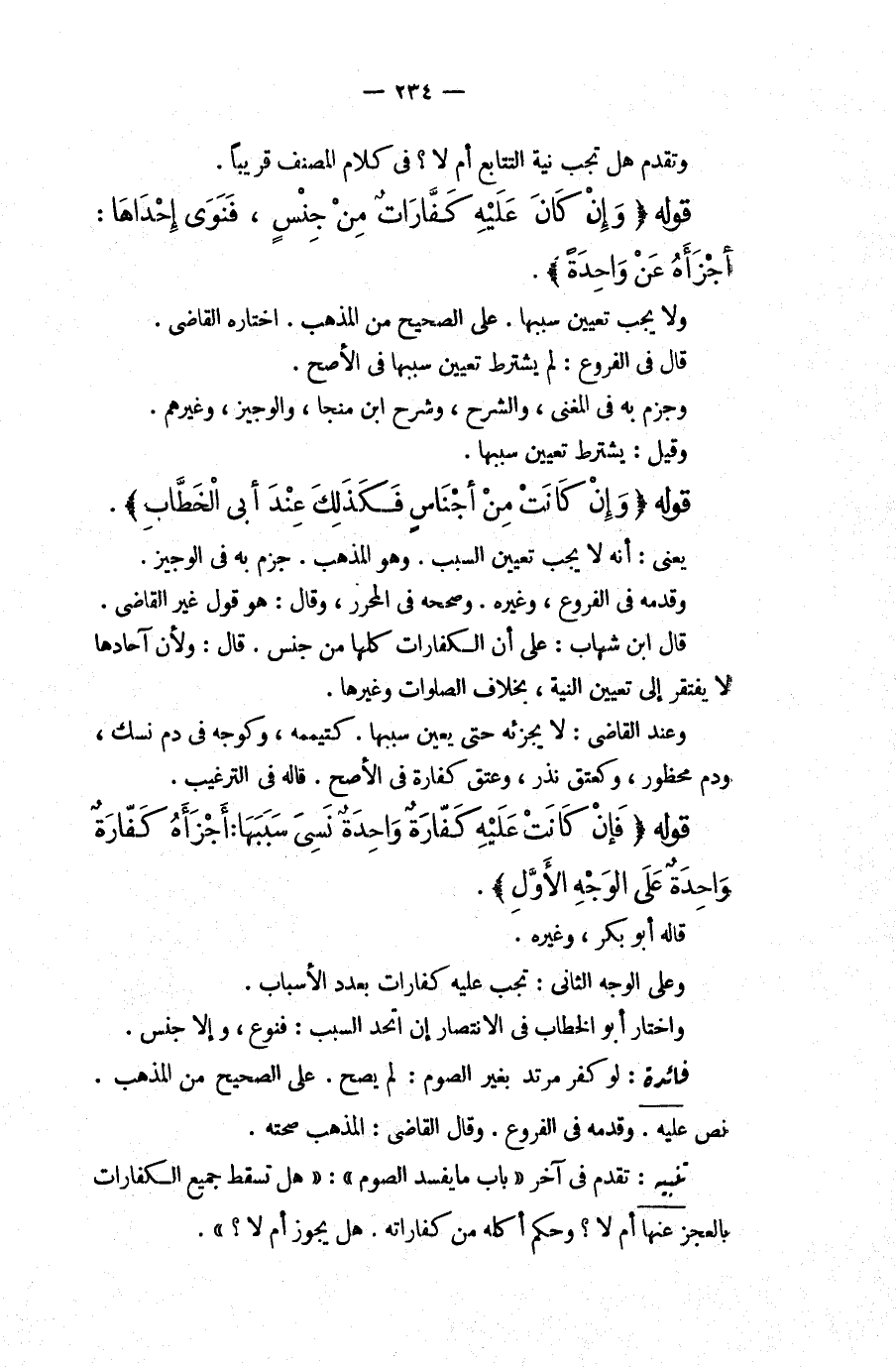 وَتَقَدَّمَ هَلْ تَجِبُ نِيَّةُ التَّتَابُعِ أَمْ لَا؟ فِي كَلَامِ الْمُصَنِّفِ قَرِيبًا. قَوْلُهُ (وَإِنْ كَانَ عَلَيْهِ كَفَّارَاتٌ مِنْ جِنْسٍ، فَنَوَى إحْدَاهَا: أَجْزَأَهُ عَنْ وَاحِدَةٍ) ، وَلَا يَجِبُ تَعْيِينُ سَبَبِهَا، عَلَى الصَّحِيحِ مِنْ الْمَذْهَبِ، اخْتَارَهُ الْقَاضِي، قَالَ فِي الْفُرُوعِ: لَمْ يُشْتَرَطْ تَعْيِينُ سَبَبِهَا فِي الْأَصَحِّ، وَجَزَمَ بِهِ فِي الْمُغْنِي، وَالشَّرْحِ، وَشَرْحِ ابْنِ مُنَجَّا، وَالْوَجِيزِ، وَغَيْرِهِمْ، وَقِيلَ: يُشْتَرَطُ تَعْيِينُ سَبَبِهَا. قَوْلُهُ (وَإِنْ كَانَتْ مِنْ أَجْنَاسٍ فَكَذَلِكَ عِنْدَ أَبِي الْخَطَّابِ) ، يَعْنِي: أَنَّهُ لَا يَجِبُ تَعْيِينُ السَّبَبِ، وَهُوَ الْمَذْهَبُ، جَزَمَ بِهِ فِي الْوَجِيزِ، وَقَدَّمَهُ فِي الْفُرُوعِ، وَغَيْرِهِ، وَصَحَّحَهُ فِي الْمُحَرَّرِ، وَقَالَ: هُوَ قَوْلُ غَيْرِ الْقَاضِي، قَالَ ابْنُ شِهَابٍ: عَلَى أَنَّ الْكَفَّارَاتِ كُلَّهَا مِنْ جِنْسٍ، قَالَ: وَلِأَنَّ آحَادَهَا لَا يَفْتَقِرُ إلَى تَعْيِينِ النِّيَّةِ، بِخِلَافِ الصَّلَوَاتِ وَغَيْرِهَا، وَعِنْدَ الْقَاضِي: لَا يُجْزِئُهُ حَتَّى يُعَيِّنَ سَبَبَهَا، كَتَيَمُّمِهِ، وَكَوَجْهٍ فِي دَمٍ نُسُكٍ، وَدَمٍ مَحْظُورٍ، وَكَعِتْقِ نَذْرٍ، وَعِتْقِ كَفَّارَةٍ فِي الْأَصَحِّ، قَالَهُ فِي التَّرْغِيبِ. قَوْلُهُ (فَإِنْ كَانَتْ عَلَيْهِ كَفَّارَةٌ وَاحِدَةٌ نَسِيَ سَبَبَهَا: أَجْزَأَهُ كَفَّارَةٌ وَاحِدَةٌ عَلَى الْوَجْهِ الْأَوَّلِ) ، قَالَهُ أَبُو بَكْرٍ، وَغَيْرُهُ، وَعَلَى الْوَجْهِ الثَّانِي: تَجِبُ عَلَيْهِ كَفَّارَاتٌ بِعَدَدِ الْأَسْبَابِ، وَاخْتَارَ أَبُو الْخَطَّابِ فِي الِانْتِصَارِ إنْ اتَّحَدَ السَّبَبُ: فَنَوْعٌ، وَإِلَّا جِنْسٌ.