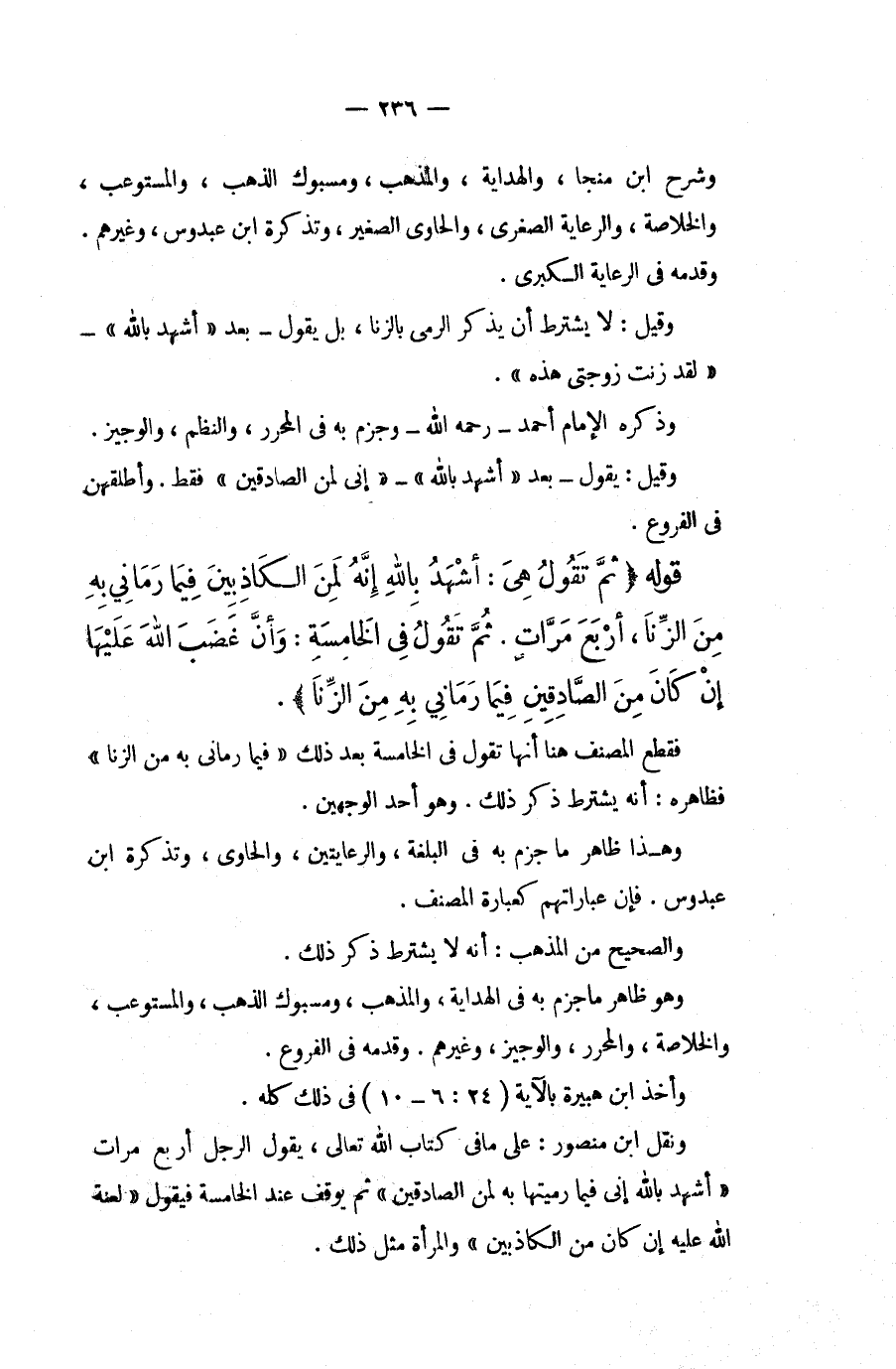 وَشَرْحِ ابْنِ مُنَجَّا، وَالْهِدَايَةِ، وَالْمُذْهَبِ، وَمَسْبُوكِ الذَّهَبِ، وَالْمُسْتَوْعِبِ، وَالْخُلَاصَةِ، وَالرِّعَايَةِ الصُّغْرَى، وَالْحَاوِي الصَّغِيرِ، وَتَذْكِرَةِ ابْنِ عَبْدُوسٍ، وَغَيْرِهِمْ، وَقَدَّمَهُ فِي الرِّعَايَةِ الْكُبْرَى، وَقِيلَ: لَا يُشْتَرَطُ أَنْ يَذْكُرَ الرَّمْيَ بِالزِّنَا، بَلْ يَقُولُ بَعْدَ " أَشْهَدُ بِاَللَّهِ " " لَقَدْ زَنَتْ زَوْجَتِي هَذِهِ "، وَذَكَرَهُ الْإِمَامُ أَحْمَدُ - رَحِمَهُ اللَّهُ - وَجَزَمَ بِهِ فِي الْمُحَرَّرِ، وَالنَّظْمِ، وَالْوَجِيزِ، وَقِيلَ: يَقُولُ بَعْدَ " أَشْهَدُ بِاَللَّهِ " " إنِّي لَمِنْ الصَّادِقِينَ " فَقَطْ، وَأَطْلَقَهُنَّ فِي الْفُرُوعِ. قَوْلُهُ (ثُمَّ تَقُولُ هِيَ: أَشْهَدُ بِاَللَّهِ إنَّهُ لَمِنْ الْكَاذِبِينَ فِيمَا رَمَانِي بِهِ مِنْ الزِّنَا، أَرْبَعَ مَرَّاتٍ، ثُمَّ تَقُولُ فِي الْخَامِسَةِ: وَأَنَّ غَضَبَ اللَّهِ عَلَيْهَا إنْ كَانَ مِنْ الصَّادِقِينَ فِيمَا رَمَانِي بِهِ مِنْ الزِّنَا) ، فَقَطَعَ الْمُصَنِّفُ هُنَا أَنَّهَا تَقُولُ فِي الْخَامِسَةِ بَعْدَ ذَلِكَ " فِيمَا رَمَانِي بِهِ مِنْ الزِّنَا " فَظَاهِرُهُ: أَنَّهُ يُشْتَرَطُ ذِكْرُ ذَلِكَ، وَهُوَ أَحَدُ الْوَجْهَيْنِ، وَهَذَا ظَاهِرُ مَا جَزَمَ بِهِ فِي الْبُلْغَةِ، وَالرِّعَايَتَيْنِ، وَالْحَاوِي، وَتَذْكِرَةِ ابْنِ عَبْدُوسٍ، فَإِنَّ عِبَارَاتِهِمْ كَعِبَارَةِ الْمُصَنِّفِ، وَالصَّحِيحُ مِنْ الْمَذْهَبِ: أَنَّهُ لَا يُشْتَرَطُ ذِكْرُ ذَلِكَ، وَهُوَ ظَاهِرُ مَا جَزَمَ بِهِ فِي الْهِدَايَةِ، وَالْمُذْهَبِ، وَمَسْبُوكِ الذَّهَبِ، وَالْمُسْتَوْعِبِ، وَالْخُلَاصَةِ، وَالْمُحَرَّرِ، وَالْوَجِيزِ، وَغَيْرِهِمْ، وَقَدَّمَهُ فِي الْفُرُوعِ، وَأَخَذَ ابْنُ هُبَيْرَةَ بِالْآيَةِ فِي ذَلِكَ كُلِّهِ، وَنَقَلَ ابْنُ مَنْصُورٍ: عَلَى مَا فِي كِتَابِ اللَّهِ تَعَالَى، يَقُولُ الرَّجُلُ أَرْبَعَ مَرَّاتٍ " أَشْهَدُ بِاَللَّهِ إنِّي فِيمَا رَمْيَتُهَا بِهِ لَمِنْ الصَّادِقِينَ " ثُمَّ يُوقَفُ عِنْدَ الْخَامِسَةِ فَيَقُولُ " لَعْنَةُ اللَّهِ عَلَيْهِ إنْ كَانَ مِنْ الْكَاذِبِينَ " وَالْمَرْأَةُ مِثْلُ ذَلِكَ.