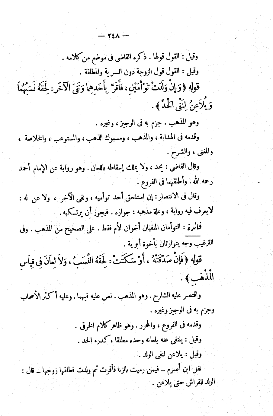 التَّوْأَمَانِ الْمَنْفِيَّانِ أَخَوَانِ لِأُمٍّ فَقَطْ، عَلَى الصَّحِيحِ مِنْ الْمَذْهَبِ، وَفِي التَّرْغِيبِ وَجْهٌ يَتَوَارَثَانِ بِأُخُوَّةٍ أَبَوِيَّةٍ. قَوْلُهُ (فَإِنْ صَدَّقَتْهُ، أَوْ سَكَتَتْ: لَحِقَهُ النَّسَبُ، وَلَا لِعَانَ فِي قِيَاسِ الْمَذْهَبِ) ، وَاقْتَصَرَ عَلَيْهِ الشَّارِحُ، وَهُوَ الْمَذْهَبُ، نَصَّ عَلَيْهِ فِيهِمَا، وَعَلَيْهِ أَكْثَرُ الْأَصْحَابِ وَجَزَمَ بِهِ فِي الْوَجِيزِ وَغَيْرِهِ، وَقَدَّمَهُ فِي الْفُرُوعِ، وَالْمُحَرَّرِ، وَهُوَ ظَاهِرُ كَلَامِ الْخِرَقِيِّ، وَقِيلَ: يَنْتَفِي عَنْهُ بِلِعَانِهِ وَحْدَهُ مُطْلَقًا كَدَرْءِ الْحَدِّ، وَقِيلَ: يُلَاعِنُ لِنَفْيِ الْوَلَدِ، نَقَلَ ابْنُ أَصْرَمَ فِيمَنْ رُمِيَتْ بِالزِّنَا فَأَقَرَّتْ ثُمَّ وَلَدَتْ فَطَلَّقَهَا زَوْجُهَا قَالَ: الْوَلَدُ لِلْفِرَاشِ حَتَّى يُلَاعِنَ.