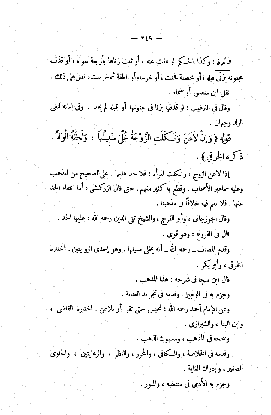 قَوْلُهُ (وَإِنْ لَاعَنَ وَنَكَلَتْ الزَّوْجَةُ خُلِّيَ سَبِيلُهَا، وَلَحِقَهُ الْوَلَدُ، ذَكَرَهُ الْخِرَقِيُّ) ، إذَا لَاعَنَ الزَّوْجُ، وَنَكَلَتْ الْمَرْأَةُ: فَلَا حَدَّ عَلَيْهَا، عَلَى الصَّحِيحِ مِنْ الْمَذْهَبِ وَعَلَيْهِ جَمَاهِيرُ الْأَصْحَابِ، وَقَطَعَ بِهِ كَثِيرٌ مِنْهُمْ، حَتَّى قَالَ الزَّرْكَشِيُّ: أَمَّا انْتِفَاءُ الْحَدِّ عَنْهَا: فَلَا نَعْلَمُ فِيهِ خِلَافًا فِي مَذْهَبِنَا، وَقَالَ الْجُوزَجَانِيُّ، وَأَبُو الْفَرَجِ، وَالشَّيْخُ تَقِيُّ الدِّينِ - رَحِمَهُ اللَّهُ -: عَلَيْهَا الْحَدُّ، قَالَ فِي الْفُرُوعِ: وَهُوَ قَوِيٌّ، وَقَدَّمَ الْمُصَنِّفُ - رَحِمَهُ اللَّهُ - أَنَّهُ يُخَلَّى سَبِيلُهَا، وَهُوَ إحْدَى الرِّوَايَتَيْنِ، اخْتَارَهُ الْخِرَقِيُّ، وَأَبُو بَكْرٍ، قَالَ ابْنُ مُنَجَّا فِي شَرْحِهِ: هَذَا الْمَذْهَبُ، وَجَزَمَ بِهِ فِي الْوَجِيزِ، وَقَدَّمَهُ فِي تَجْرِيدِ الْعِنَايَةِ، وَعَنْ الْإِمَامِ أَحْمَدَ - رَحِمَهُ اللَّهُ -: تُحْبَسُ حَتَّى تُقِرَّ أَوْ تُلَاعِنَ، اخْتَارَهُ الْقَاضِي، وَابْنُ الْبَنَّا، وَالشِّيرَازِيُّ، وَصَحَّحَهُ فِي الْمُذْهَبِ، وَمَسْبُوكِ الذَّهَبِ، وَقَدَّمَهُ فِي الْخُلَاصَةِ، وَالْكَافِي، وَالْمُحَرَّرِ، وَالنَّظْمِ، وَالرِّعَايَتَيْنِ، وَالْحَاوِي الصَّغِيرِ، وَإِدْرَاكِ الْغَايَةِ، وَجَزَمَ بِهِ الْأَدَمِيِّ فِي مُنْتَخَبِهِ، وَالْمُنَوِّرِ،