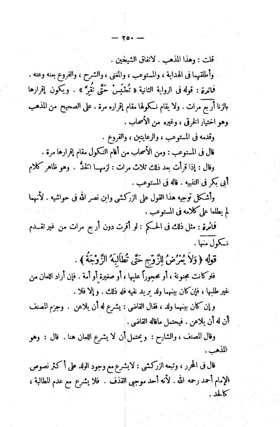 مِثْلُ ذَلِكَ فِي الْحُكْمِ: لَوْ أَقَرَّتْ دُونَ أَرْبَعِ مَرَّاتٍ مِنْ غَيْرِ تَقَدُّمِ نُكُولٍ مِنْهَا. قَوْلُهُ (وَلَا يُعْرَضُ لِلزَّوْجِ حَتَّى تُطَالِبَهُ الزَّوْجَةُ) ، فَلَوْ كَانَتْ مَجْنُونَةً، أَوْ مَحْجُورًا عَلَيْهَا، أَوْ صَغِيرَةً أَوْ أَمَةً، فَإِنْ أَرَادَ اللِّعَانَ مِنْ غَيْرِ طَلَبِهَا، فَإِنْ كَانَ بَيْنَهُمَا وَلَدٌ يُرِيدُ نَفْيَهُ فَلَهُ ذَلِكَ، وَإِلَّا فَلَا، وَإِنْ كَانَ بَيْنَهُمَا وَلَدٌ، فَقَالَ الْقَاضِي: يُشْرَعُ لَهُ أَنْ يُلَاعِنَ، وَجَزَمَ الْمُصَنِّفُ أَنَّ لَهُ أَنْ يُلَاعِنَ، فَيَحْتَمِلُ مَا قَالَهُ الْقَاضِي، وَقَالَ الْمُصَنِّفُ، وَالشَّارِحُ: وَيَحْتَمِلُ أَنْ لَا يُشْرَعَ اللِّعَانُ هُنَا، قَالَ: وَهُوَ الْمَذْهَبُ، قَالَ فِي الْمُحَرَّرِ، وَتَبِعَهُ الزَّرْكَشِيُّ: لَا يُشْرَعُ مَعَ وُجُودِ الْوَلَدِ عَلَى أَكْثَرِ نُصُوصِ الْإِمَامِ أَحْمَدَ - رَحِمَهُ اللَّهُ -؛ لِأَنَّهُ أَحَدُ مُوجِبَيْ الْقَذْفِ، فَلَا يُشْرَعُ مَعَ عَدَمِ الْمُطَالَبَةِ كَالْحَدِّ،