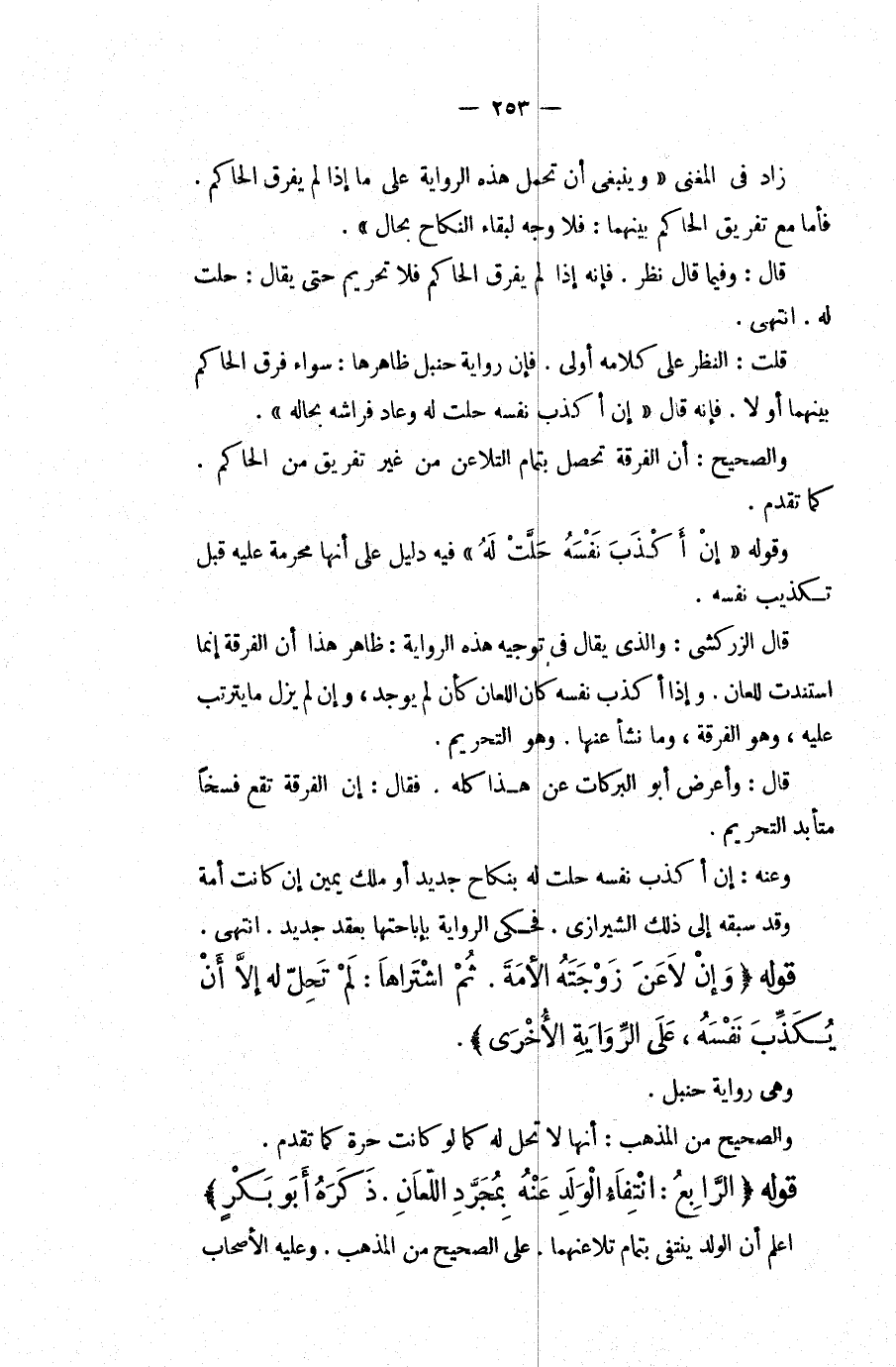 قُلْت: النَّظَرُ عَلَى كَلَامِهِ أَوْلَى، فَإِنَّ رِوَايَةَ حَنْبَلٍ ظَاهِرُهَا: سَوَاءٌ فَرَّقَ الْحَاكِمُ بَيْنَهُمَا أَوْ لَا، فَإِنَّهُ قَالَ " إنْ أَكْذَبَ نَفْسَهُ حَلَّتْ لَهُ وَعَادَ فِرَاشُهُ بِحَالِهِ "، وَالصَّحِيحُ: أَنَّ الْفُرْقَةَ تَحْصُلُ بِتَمَامِ التَّلَاعُنِ مِنْ غَيْرِ تَفْرِيقٍ مِنْ الْحَاكِمِ، كَمَا تَقَدَّمَ، وَقَوْلُهُ " إنْ أَكْذَبَ نَفْسَهُ حَلَّتْ لَهُ " فِيهِ دَلِيلٌ عَلَى أَنَّهَا مُحَرَّمَةٌ عَلَيْهِ قَبْلَ تَكْذِيبِ نَفْسِهِ، قَالَ الزَّرْكَشِيُّ: وَاَلَّذِي يُقَالُ فِي تَوْجِيهِ هَذِهِ الرِّوَايَةِ: ظَاهِرُ هَذَا أَنَّ الْفُرْقَةَ إنَّمَا اسْتَنَدَتْ لِلِّعَانِ، وَإِذَا أَكْذَبَ نَفْسَهُ كَانَ اللِّعَانُ كَأَنْ لَمْ يُوجَدْ، وَإِنْ لَمْ يَزُلْ مَا يَتَرَتَّبُ عَلَيْهِ، وَهُوَ الْفُرْقَةُ، وَمَا نَشَأَ عَنْهَا، وَهُوَ التَّحْرِيمُ، قَالَ: وَأَعْرَضَ أَبُو الْبَرَكَاتِ عَنْ هَذَا كُلِّهِ، فَقَالَ: إنَّ الْفُرْقَةَ تَقَعُ فَسْخًا مُتَأَبِّدَ التَّحْرِيمِ، وَعَنْهُ: إنْ أَكْذَبَ نَفْسَهُ حَلَّتْ لَهُ بِنِكَاحٍ جَدِيدٍ أَوْ مِلْكِ يَمِينٍ إنْ كَانَتْ أَمَةً وَقَدْ سَبَقَهُ إلَى ذَلِكَ الشِّيرَازِيُّ، فَحَكَى الرِّوَايَةَ بِإِبَاحَتِهَا بِعَقْدٍ جَدِيدٍ. انْتَهَى.