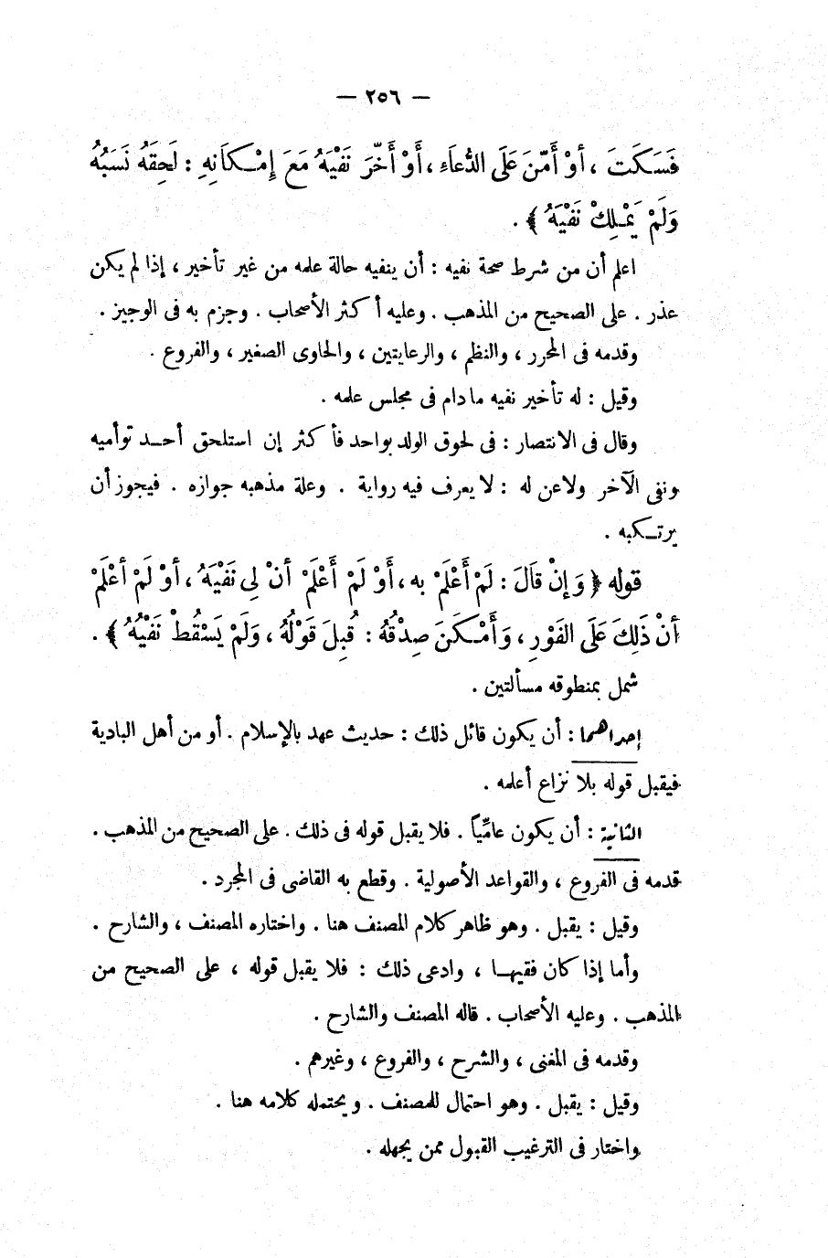 قَوْلُهُ (وَإِنْ قَالَ: لَمْ أَعْلَمْ بِهِ، أَوْ لَمْ أَعْلَمْ أَنَّ لِي نَفْيَهُ، أَوْ لَمْ أَعْلَمْ أَنَّ ذَلِكَ عَلَى الْفَوْرِ، وَأَمْكَنَ صِدْقُهُ: قُبِلَ قَوْلُهُ، وَلَمْ يَسْقُطْ نَفْيُهُ) . شَمِلَ بِمَنْطُوقِهِ مَسْأَلَتَيْنِ.