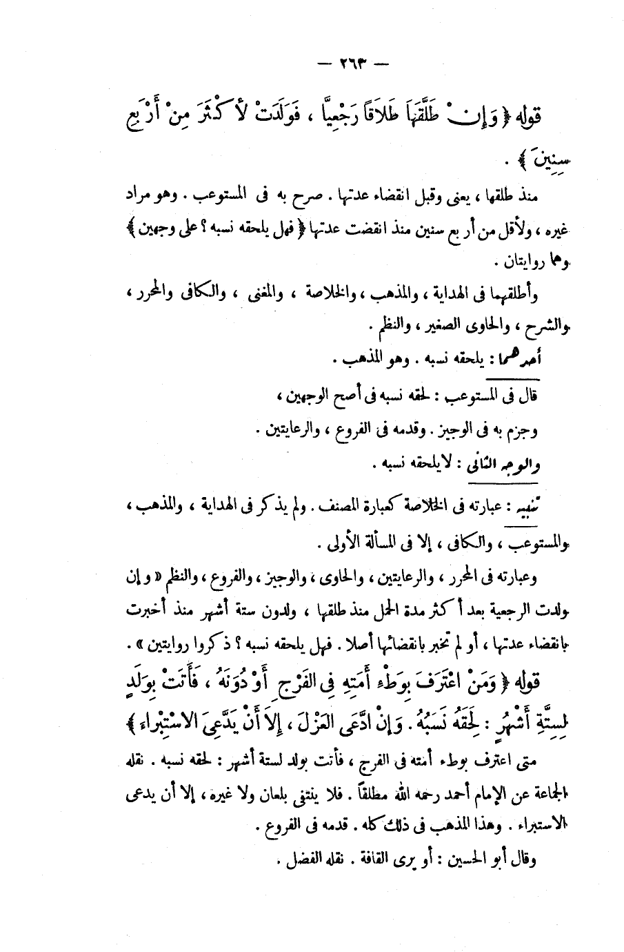 قَوْلُهُ (وَإِنْ طَلَّقَهَا طَلَاقًا رَجْعِيًّا، فَوَلَدَتْ لِأَكْثَرَ مِنْ أَرْبَعِ سِنِينَ) . مُنْذُ طَلَّقَهَا، يَعْنِي وَقَبْلَ انْقِضَاءِ عِدَّتِهَا. صَرَّحَ بِهِ فِي الْمُسْتَوْعِبِ. وَهُوَ مُرَادُ غَيْرِهِ، وَلِأَقَلَّ مِنْ أَرْبَعِ سِنِينَ مُنْذُ انْقَضَتْ عِدَّتُهَا (فَهَلْ يَلْحَقُهُ نَسَبُهُ؟ عَلَى وَجْهَيْنِ) وَهُمَا رِوَايَتَانِ. وَأَطْلَقَهَا فِي الْهِدَايَةِ، وَالْمُذْهَبِ، وَالْخُلَاصَةِ، وَالْمُغْنِي، وَالْكَافِي وَالْمُحَرَّرِ، وَالشَّرْحِ، وَالْحَاوِي الصَّغِيرِ، وَالنَّظْمِ.
