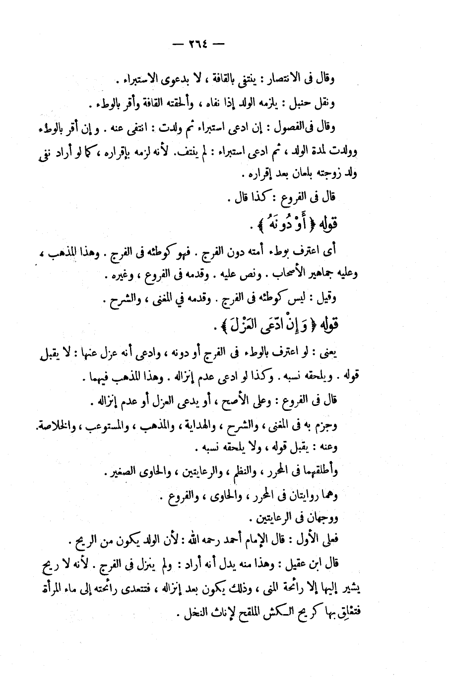 وَقَالَ فِي الِانْتِصَارِ: يَنْتَفِي بِالْقَافَةِ، لَا بِدَعْوَى الِاسْتِبْرَاءِ. وَنَقَلَ حَنْبَلٌ: يَلْزَمُهُ الْوَلَدُ إذَا نَفَاهُ، وَأَلْحَقَتْهُ الْقَافَةُ وَأَقَرَّ بِالْوَطْءِ. وَقَالَ فِي الْفُصُولِ: إنْ ادَّعَى اسْتِبْرَاءً ثُمَّ وَلَدَتْ: انْتَفَى عَنْهُ. وَإِنْ أَقَرَّ بِالْوَطْءِ وَوَلَدَتْ لِمُدَّةِ الْوَلَدِ، ثُمَّ ادَّعَى اسْتِبْرَاءً: لَمْ يَنْتَفِ. لِأَنَّهُ لَزِمَهُ بِإِقْرَارِهِ كَمَا لَوْ أَرَادَ نَفْيَ وَلَدِ زَوْجَتِهِ بِلِعَانٍ بَعْدَ إقْرَارِهِ. قَالَ فِي الْفُرُوعِ: كَذَا قَالَ.