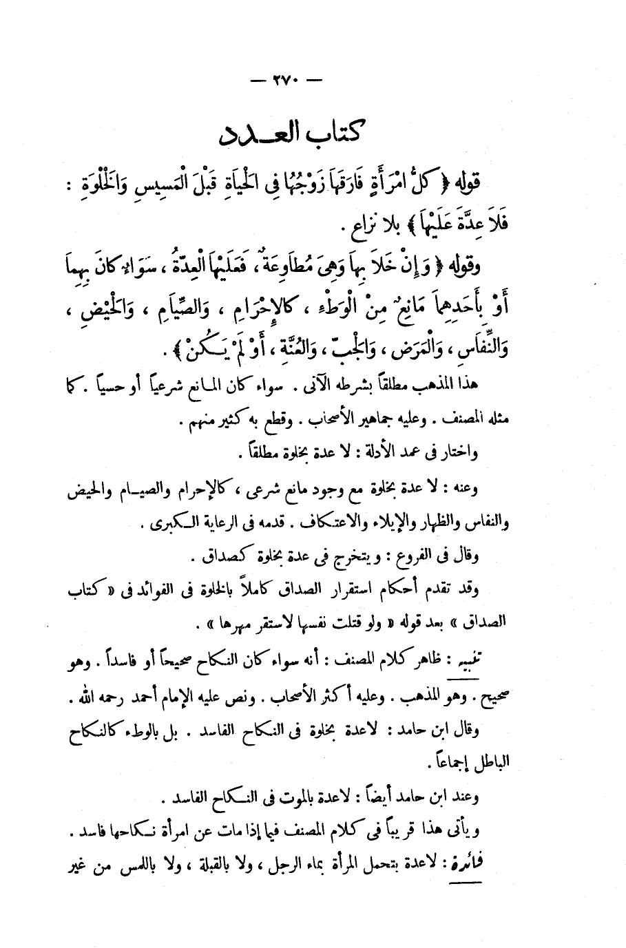 وَقَوْلُهُ (وَإِنْ خَلَا بِهَا وَهِيَ مُطَاوَعَةٌ، فَعَلَيْهَا الْعِدَّةُ، سَوَاءٌ كَانَ بِهِمَا أَوْ بِأَحَدِهِمَا مَانِعٌ مِنْ الْوَطْءِ، كَالْإِحْرَامِ، وَالصِّيَامِ، وَالْحَيْضِ، وَالنِّفَاسِ، وَالْمَرَضِ، وَالْجَبِّ، وَالْعُنَّةِ، أَوْ لَمْ يَكُنْ) . هَذَا الْمَذْهَبُ مُطْلَقٌ بِشَرْطِهِ الْآتِي. سَوَاءٌ كَانَ الْمَانِعُ شَرْعِيًّا أَوْ حِسِّيًّا. كَمَا مَثَّلَهُ الْمُصَنِّفُ. وَعَلَيْهِ جَمَاهِيرُ الْأَصْحَابِ. وَقَطَعَ بِهِ كَثِيرٌ مِنْهُمْ. وَاخْتَارَ فِي عُمَدِ الْأَدِلَّةِ: لَا عِدَّةَ بِخَلْوَةٍ مُطْلَقًا. وَعَنْهُ: لَا عِدَّةَ بِخَلْوَةٍ مَعَ وُجُودِ مَانِعٍ شَرْعِيٍّ، كَالْإِحْرَامِ وَالصِّيَامِ وَالْحَيْضِ وَالنِّفَاسِ وَالظِّهَارِ وَالْإِيلَاءِ وَالِاعْتِكَافِ. قَدَّمَهُ فِي الرِّعَايَةِ الْكُبْرَى. وَقَالَ فِي الْفُرُوعِ: وَيَتَخَرَّجُ فِي عِدَّةٍ بِخَلْوَةٍ كَصَدَاقٍ. وَقَدْ تَقَدَّمَ أَحْكَامُ اسْتِقْرَارِ الصَّدَاقِ كَامِلًا بِالْخَلْوَةِ فِي الْفَوَائِدِ فِي " كِتَابِ الصَّدَاقِ " بَعْدَ قَوْلِهِ " وَلَوْ قَتَلَتْ نَفْسَهَا لَاسْتَقَرَّ مَهْرُهَا ".