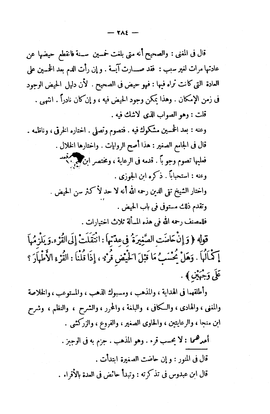 قَالَ فِي الْمُغْنِي: وَالصَّحِيحُ أَنَّهُ مَتَى بَلَغَتْ خَمْسِينَ سَنَةً فَانْقَطَعَ حَيْضُهَا عَنْ عَادَتِهَا مَرَّاتٌ لِغَيْرِ سَبَبٍ: فَقَدْ صَارَتْ آيِسَةً. وَإِنْ رَأَتْ الدَّمَ بَعْدَ الْخَمْسِينَ عَلَى الْعَادَةِ الَّتِي كَانَتْ تَرَاهُ فِيهَا: فَهُوَ حَيْضٌ فِي الصَّحِيحِ. لِأَنَّ دَلِيلَ الْحَيْضِ الْوُجُودُ فِي زَمَنِ الْإِمْكَانِ. وَهَذَا يُمْكِنُ وُجُودُ الْحَيْضِ فِيهِ، وَإِنْ كَانَ نَادِرًا. انْتَهَى. قُلْت: وَهُوَ الصَّوَابُ الَّذِي لَا شَكَّ فِيهِ. وَعَنْهُ: بَعْدَ الْخَمْسِينَ مَشْكُوكٌ فِيهِ. فَتَصُومُ وَتُصَلِّي. اخْتَارَهُ الْخِرَقِيُّ، وَنَاظِمُهُ. قَالَ فِي الْجَامِعِ الصَّغِيرِ: هَذَا أَصَحُّ الرِّوَايَاتِ. وَاخْتَارَهَا الْخَلَّالُ. فَعَلَيْهَا تَصُومُ وُجُوبًا. قَدَّمَهُ فِي الرِّعَايَةِ، وَمُخْتَصَرِ ابْنِ تَمِيمٍ. وَعَنْهُ: اسْتِحْبَابًا. ذَكَرَهُ ابْنُ الْجَوْزِيِّ. وَاخْتَارَ الشَّيْخُ تَقِيُّ الدِّينِ - رَحِمَهُ اللَّهُ - أَنَّهُ لَا حَدَّ لِأَكْثَرِ سِنِّ الْحَيْضِ. وَتَقَدَّمَ ذَلِكَ مُسْتَوْفًى فِي بَابِ الْحَيْضِ. فَلِلْمُصَنِّفِ - رَحِمَهُ اللَّهُ - فِي هَذِهِ الْمَسْأَلَةِ ثَلَاثُ اخْتِيَارَاتٍ.